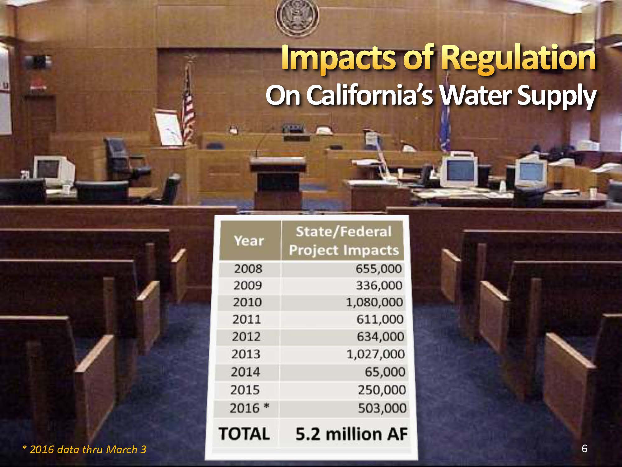 He presented a slide showing the impact of some of these regulations under the biological opinions over the last 9 years for both the Central Valley Project and the State Water Project. “It totals about 5.2 MAF; that’s on average a little less than 600,000 AF a year,” he said.