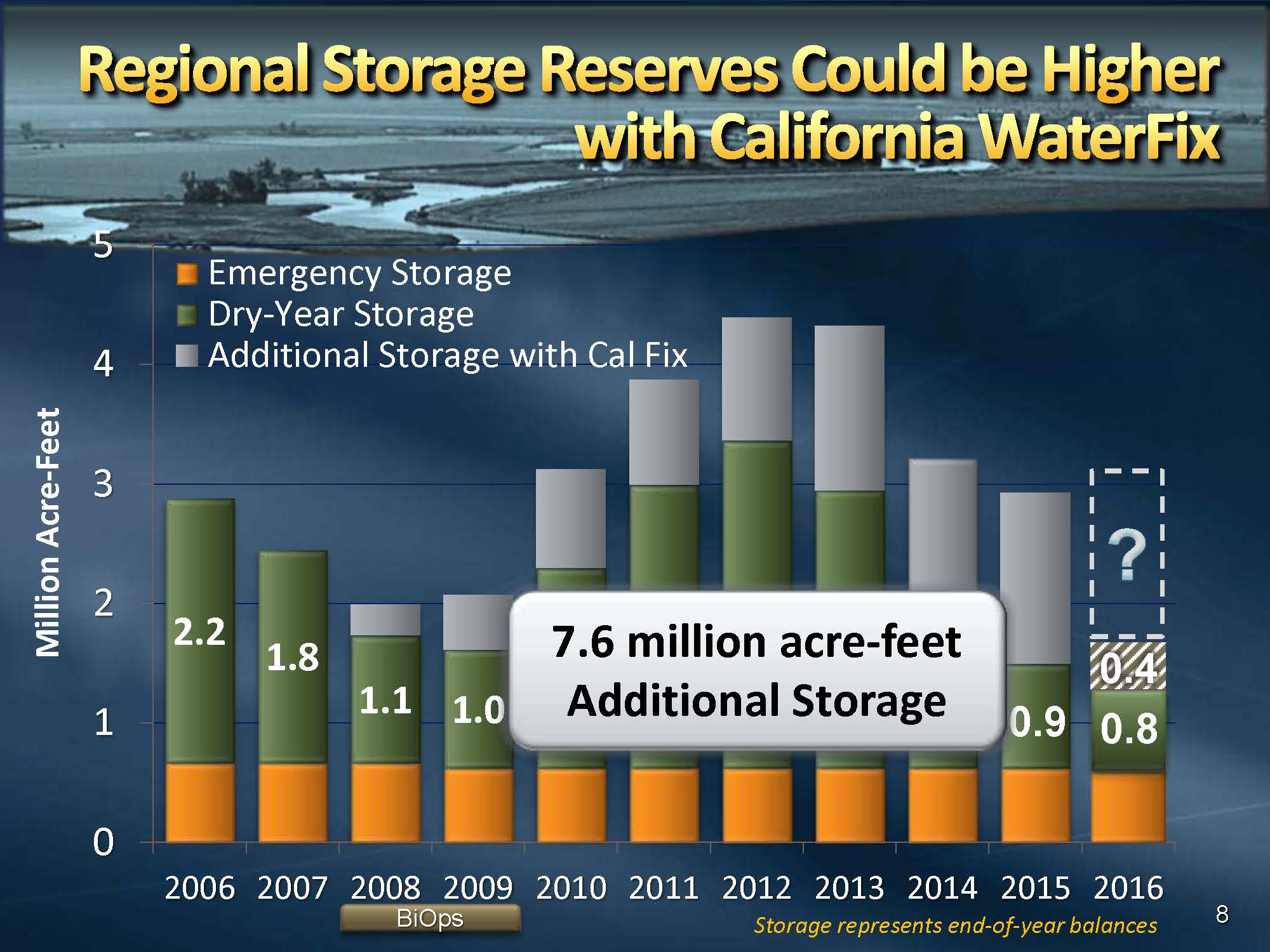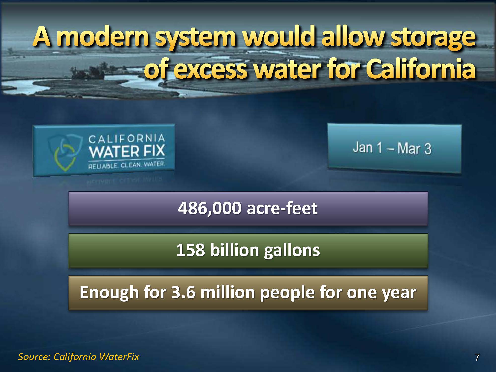 With the California Water Fix project with the new modern system with more fish friendly intakes, the state of California, calculates that from January 1st through March 3rd, we could have put about another 486,00 AF in storage – enough for 3.6 million people, he said.