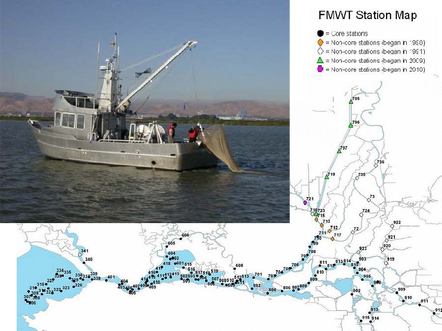 One of the surveys is the Fall Midwater Trawl Survey, initiated in 1967, which samples numerous locations in the upstream portion of the estuary four months in the fall. “They drag a trawl, they collect fish, they identify all those fish, they count how many fish they get, and they look at it across the entire region for which they are surveying,” Dr. Swanson said. “One of the things they do for some of those species is they calculate what’s referred to as the Fall Midwater Trawl Abundance Index. This is actually not an actual count of fish; it’s an estimate of the abundance of those fish species in the system, compared to how many are being caught per area sampled, and it’s most useful to track the abundance of those fish over time. The actual number doesn’t mean a whole lot, but it does mean a whole lot when you compare one year to the next to the next.”