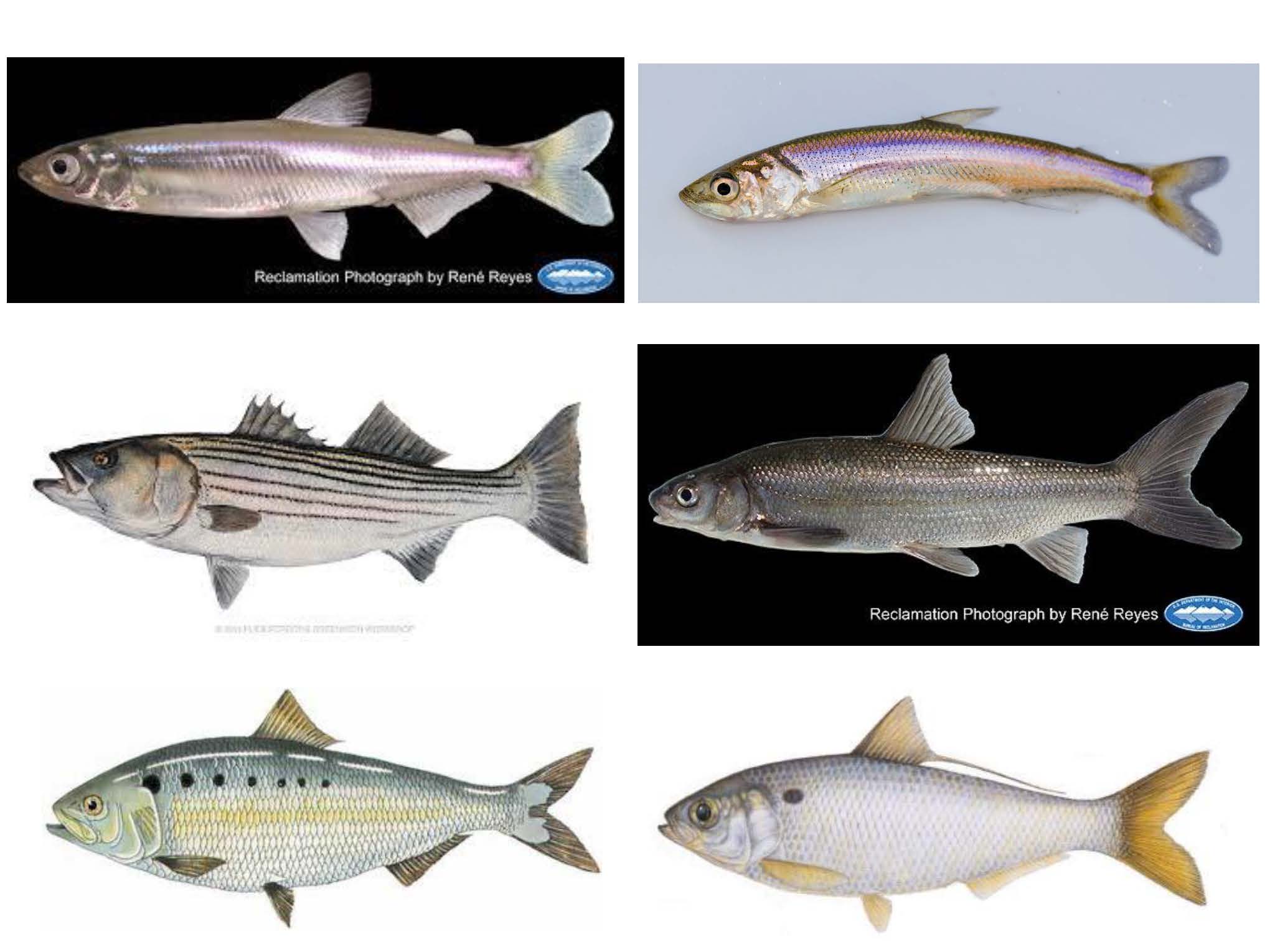 She presented a slide of the six species for which the Department of Fish and Wildlife have been tracking since the beginning of the trawl, noting that these are the formerly most common species in the system. She noted that the Delta smelt, longfin smelt, and splittail, shown on top as photographs, are native species endemic to this system; the bottom three, shown as drawings, are nonnative species.