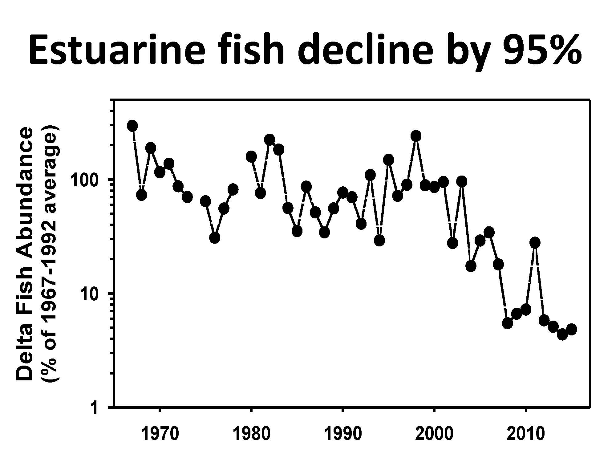 Dr. Swanson pointed out that she was presenting the data in what’s called a logarithmic scale. “Because if this is 100%, starting in the 2000s, the populations of all of these species basically declined markedly, you could say plummeted. They fell 95%. In the last several years, of course which does correspond to dry years, the collective abundance of all these species is just 5% of what it was during the first 25 years of this survey. For some of the species, it’s worse than that. For Delta smelt and longfin smelt, it’s like 1% of their abundance just 30 years ago today.”