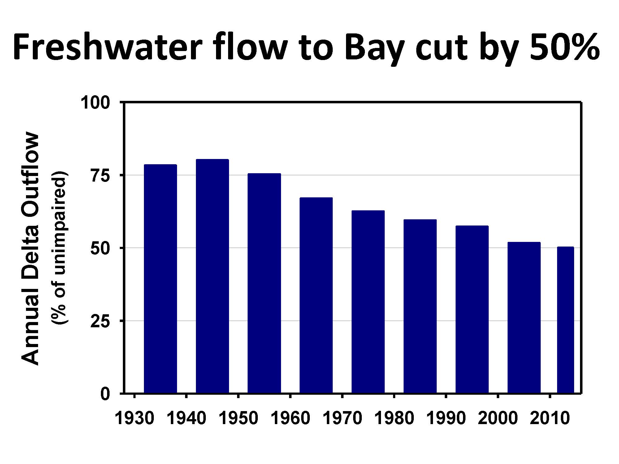 She presented a graph that depicts annual Delta outflow by decade from the 1930s to present day. “This is the average percent of the runoff from the mountains that actually got to the estuary,” she said. “Even in the 30s, we were taking water out of the rivers for farming; however progressively since about 1950, the percentage of water that is running out of the mountains as snowmelt or river flows that actually reaches the estuary and has been going down and down and down to the point where now, on average, it’s 50% or less. Ecologically speaking, in terms of the functions of rivers or estuaries, that is not ecologically viable. That is not sufficient to maintain a healthy aquatic ecosystem. This is a pressure on the system.”