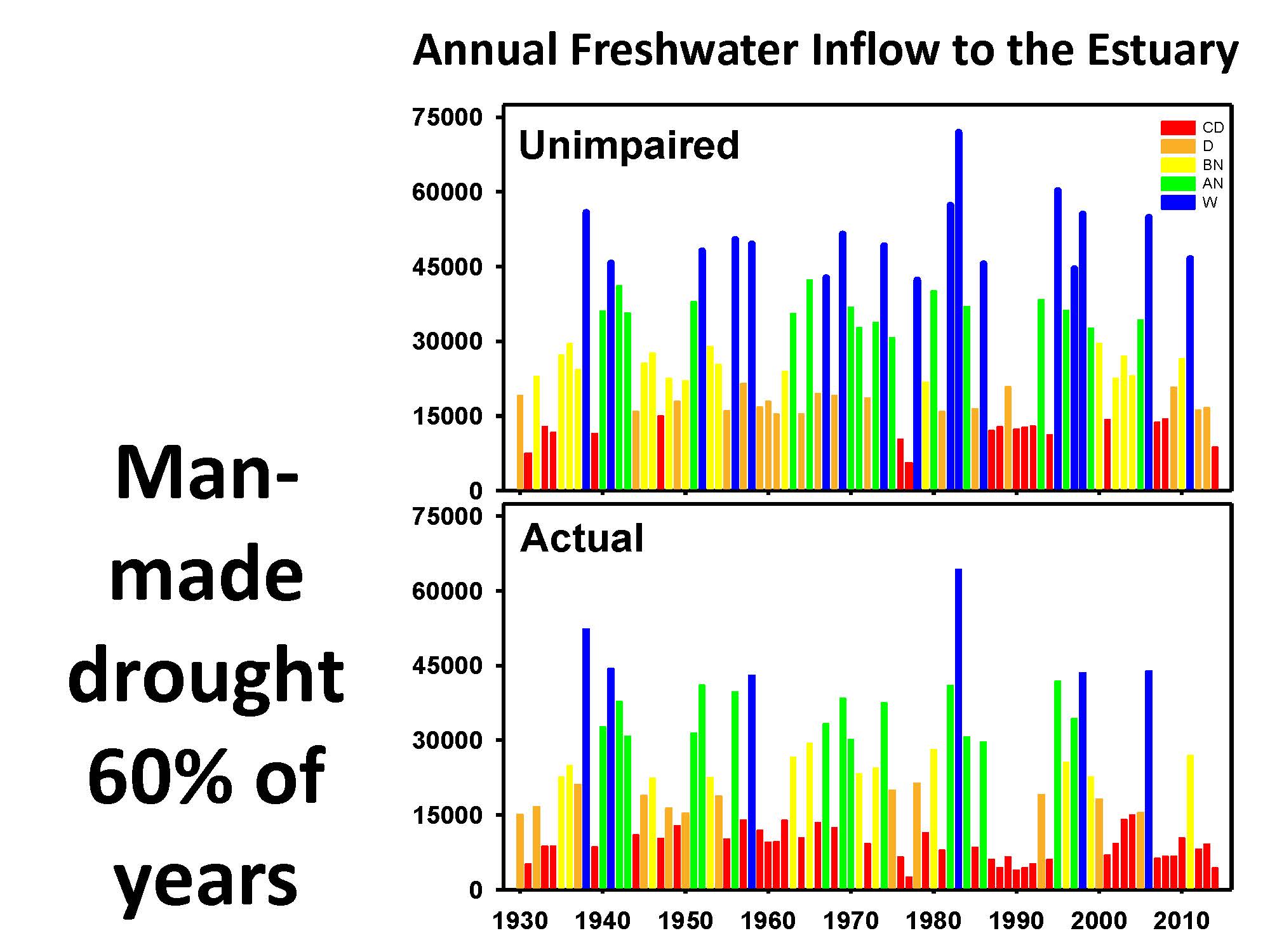 There are consequences, Dr. Swanson pointed out. “One of the things we all know about California is that from year to year, we get wet years and dry years,” she said. “What this graph shows is the consequence of that water being diverted from the system. We’ve taken a system which over this 80 year period saw wet years and dry years, which are being expressed in that upper graph: wet years are blue, dry years are red. Now the estuary, the San Francisco Bay estuary, as far as it can tell, based on the amount of water its getting, is in chronic man made drought.”