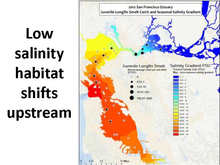 The consequences of low freshwater flows is that it changes how the salinity is distributed within the estuary as it allows more salt water to encroach up into the upper portions of the estuary, she said. “For fish, that changes the habitat; for us it also has consequences because we’re trying to draw freshwater out of the upper portion of the estuary. In fact, as the consequence of our water management operations, we are now most often managing this estuary to have just enough freshwater flow to flow out of the Delta to keep the water fresh enough for that water to be useful to us. We’re running it right on the edge, so when you hear some of the complaints being made about freshwater flowing out of the Delta into the estuary and saying we really should be capturing that, scientifically speaking and quite frankly policy speaking, that’s nonsense. That water is needed to flow out; otherwise the utility of the Delta as a source of water is useless.”