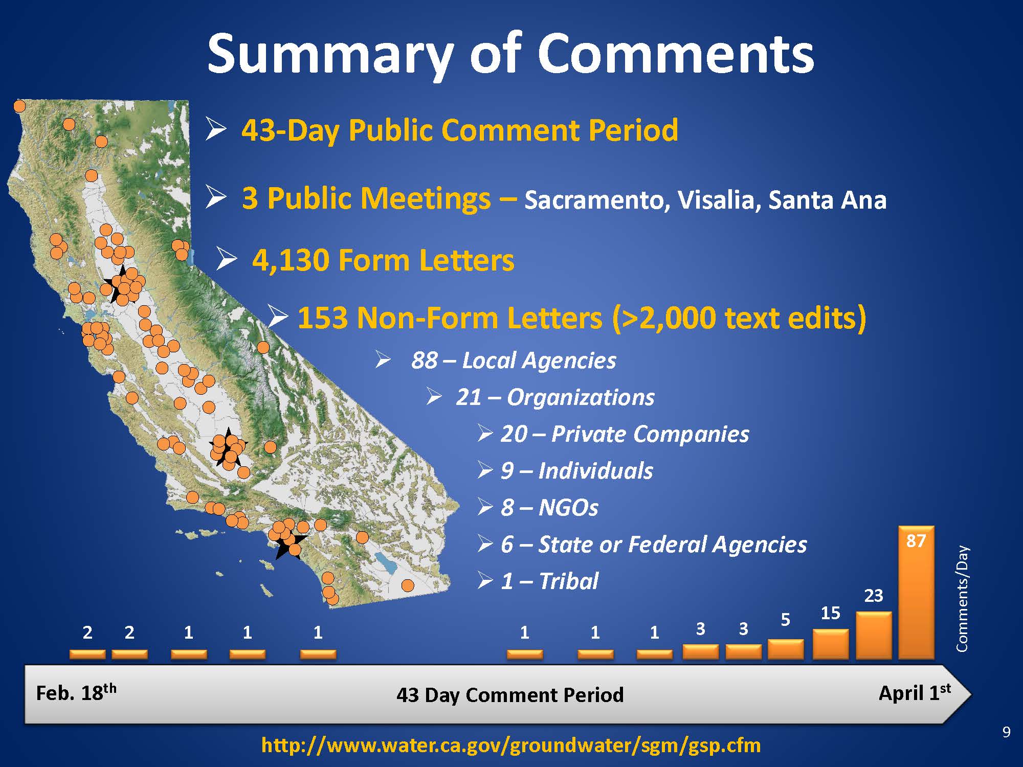 The comment period opened on February 18th and closed on April 1st. There were three public meetings held in Sacramento, Visalia, and Santa Ana. The Department received 153 formal comments from a diverse set of interests from across the state, as well as more than 4100 form letters, specifically from the Sierra Club. The 153 comments generated more than 2000 text edits or specific comments, he said. Most comments were received at the end of the public comment period and all the comments received are posted on the website, http://www.water.ca.gov/groundwater/sgm/gsp.cfm.