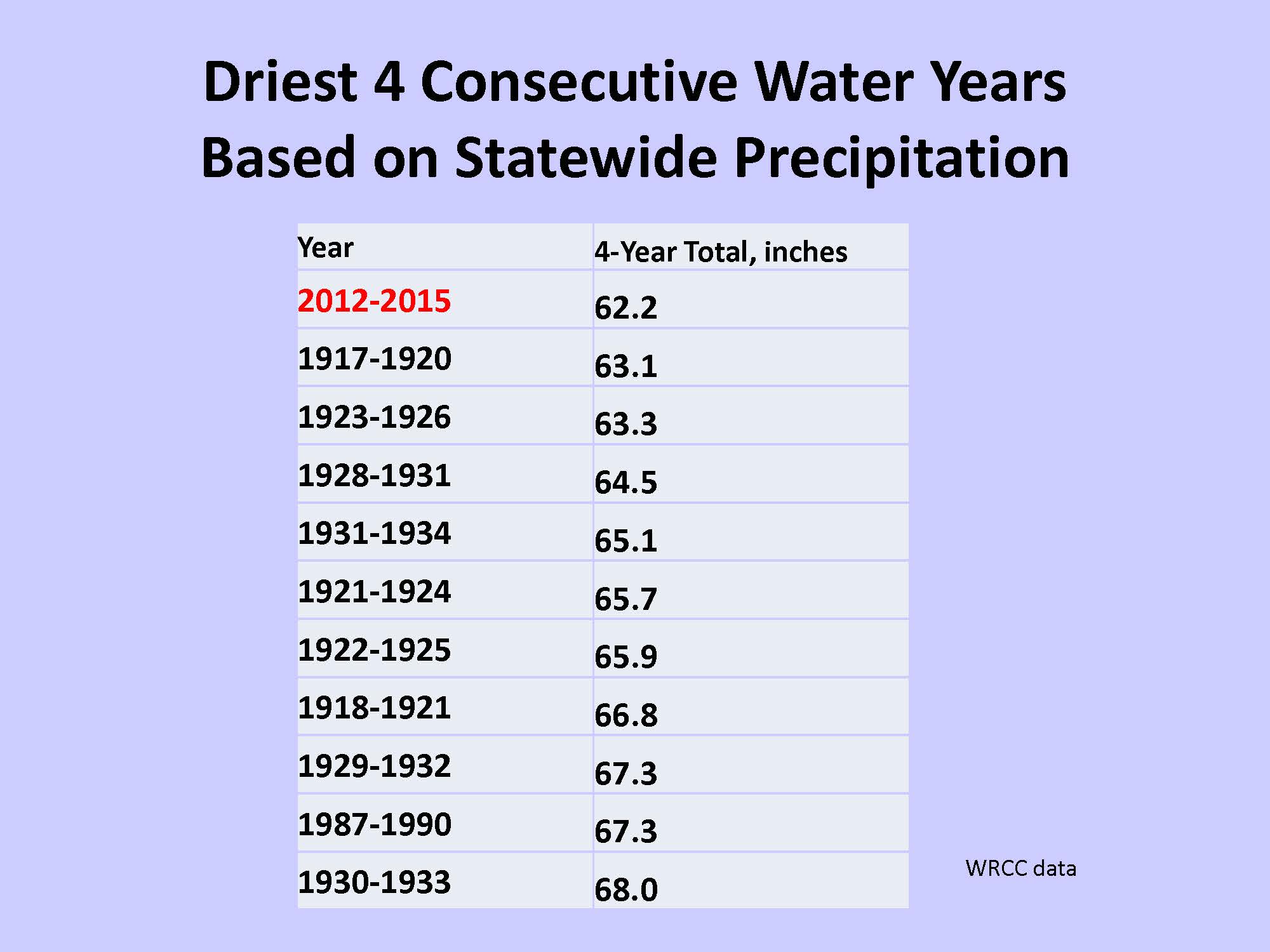 “If we want to think about how dry has it been recently in a historical context, and if we want to go shopping for a first place record so to speak, one that we could look at is that our prior four water years do rank as the driest in the historical record if you use statewide precipitation as a metric,” she said. “If you look at this chart, you see a dominance of many of other years from that very dry period in the 1920s and the 1930s.”