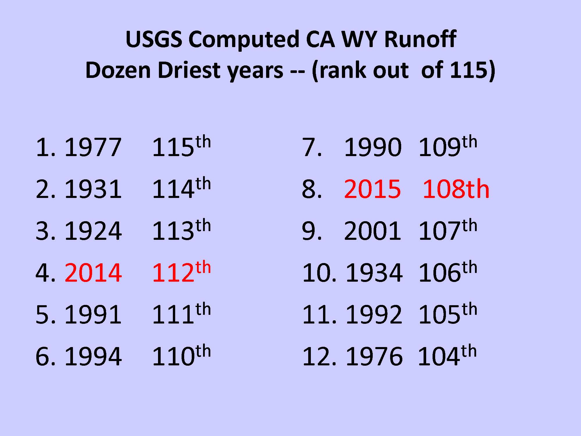 Ms. Jones said that in terms of statewide runoff single year ranking, 2014 ranks fourth out of 115 years. She noted that 1977 holds the record as driest, but 2015 also in the top dozen as well. “So clearly in terms of looking at the historical record, we have some fairly significant metrics here.”