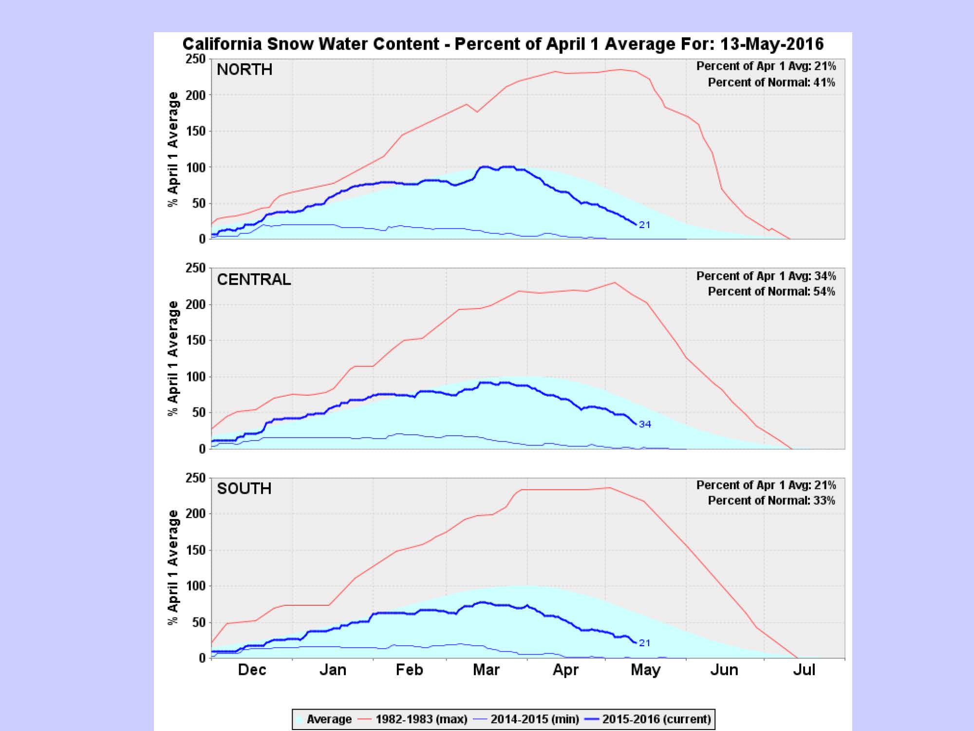 Ms. Jones then presented a plot of snow water content for the northern, central, and southern Sierra, noting that the blue shaded curve depicts the average. “So we sort of touched average, just barely in the northern part of the state, and below average to the south. 90% would be the statewide average in terms of percent of April 1 snowpack, which is a metric that we use to gauge snow conditions because that’s historically been about the time of maximum accumulation. The bottom trace on this graph was last year when we set the record.”