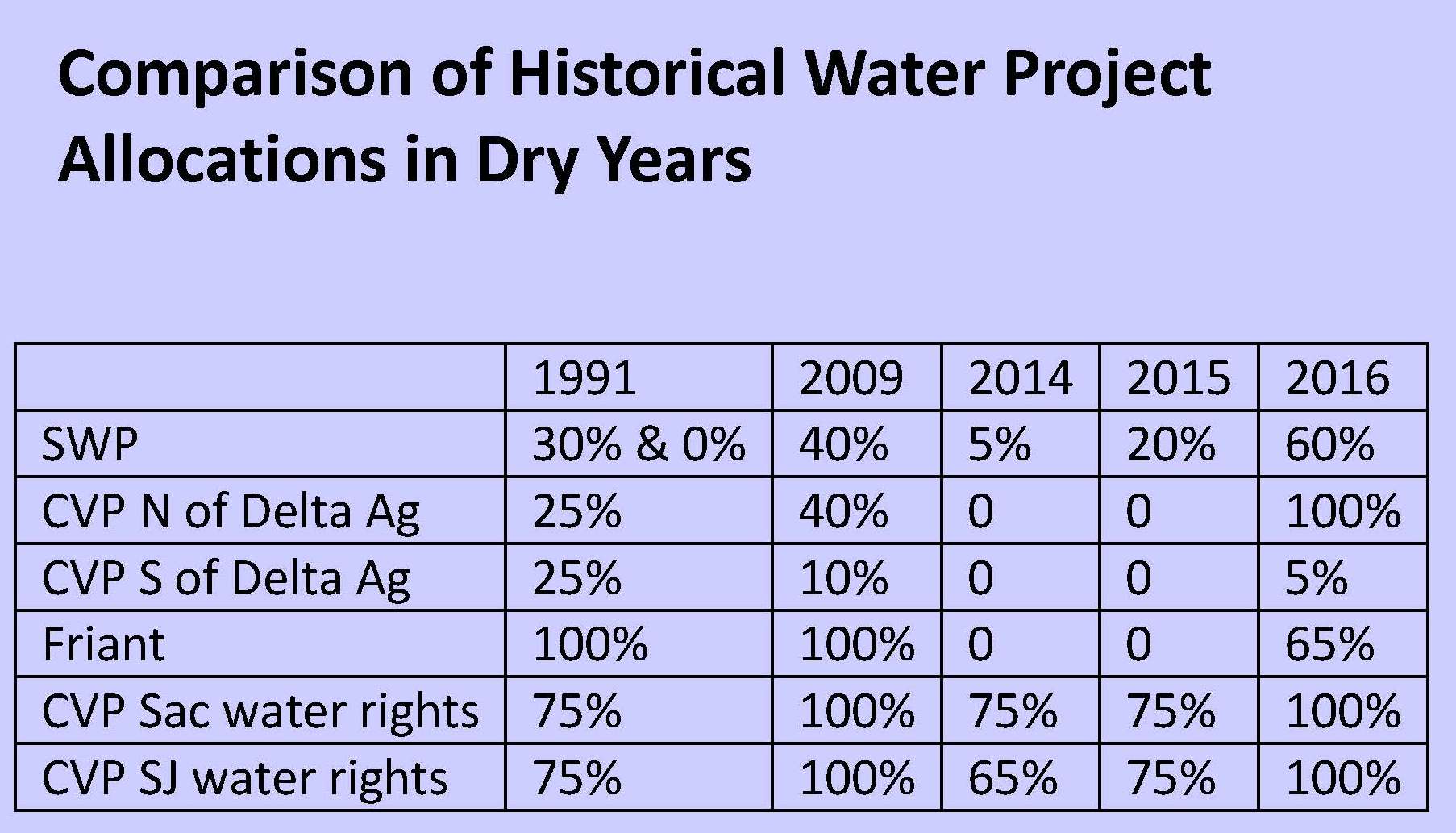 Ms. Jones then presented a slide showing a comparison of water allocations for the State Water Project and the federal Central Valley Project in recent years. “If we think about the Central Valley Project and the supplies to the San Joaquin Valley which have really been one of the major drought impacts in this last cycle, two years in a row of zero supplies unprecedented and the cuts to their San Joaquin Valley agricultural customers, well this year the good news is they are getting 5% supply. Clearly that’s not enough to sustain the agriculture that has developed a reliance on Central Valley Project supplies and therefore people have to turn to groundwater to make up the difference. For the State Water Project, we’re up to a 60% allocation for the project now as compared to 20% last year.”