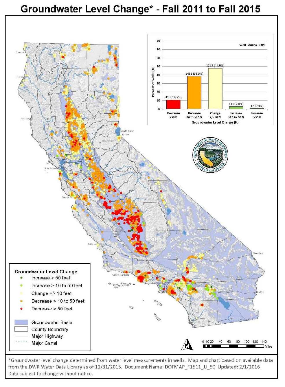 Drought has a number of different kinds of impacts that have been the focus of a lot of attention, resources and effort in the last few years. “One of those impacts is on groundwater,” Ms. Jones said, presenting groundwater level maps from the CASGEM program for the fall of 2015. “Some wells particularly in the southern San Joaquin Valley over this time period have dropped more than 50 feet and frankly some have dropped more than 100 feet in elevation, which is not surprising because people whose surface water supplies are reduced to nothing or almost nothing will turn to groundwater if that resource is available to them. We are just about to post the spring groundwater level change maps on our groundwater website now, and they too show similar impacts in terms of long-term effects of dry conditions.”
