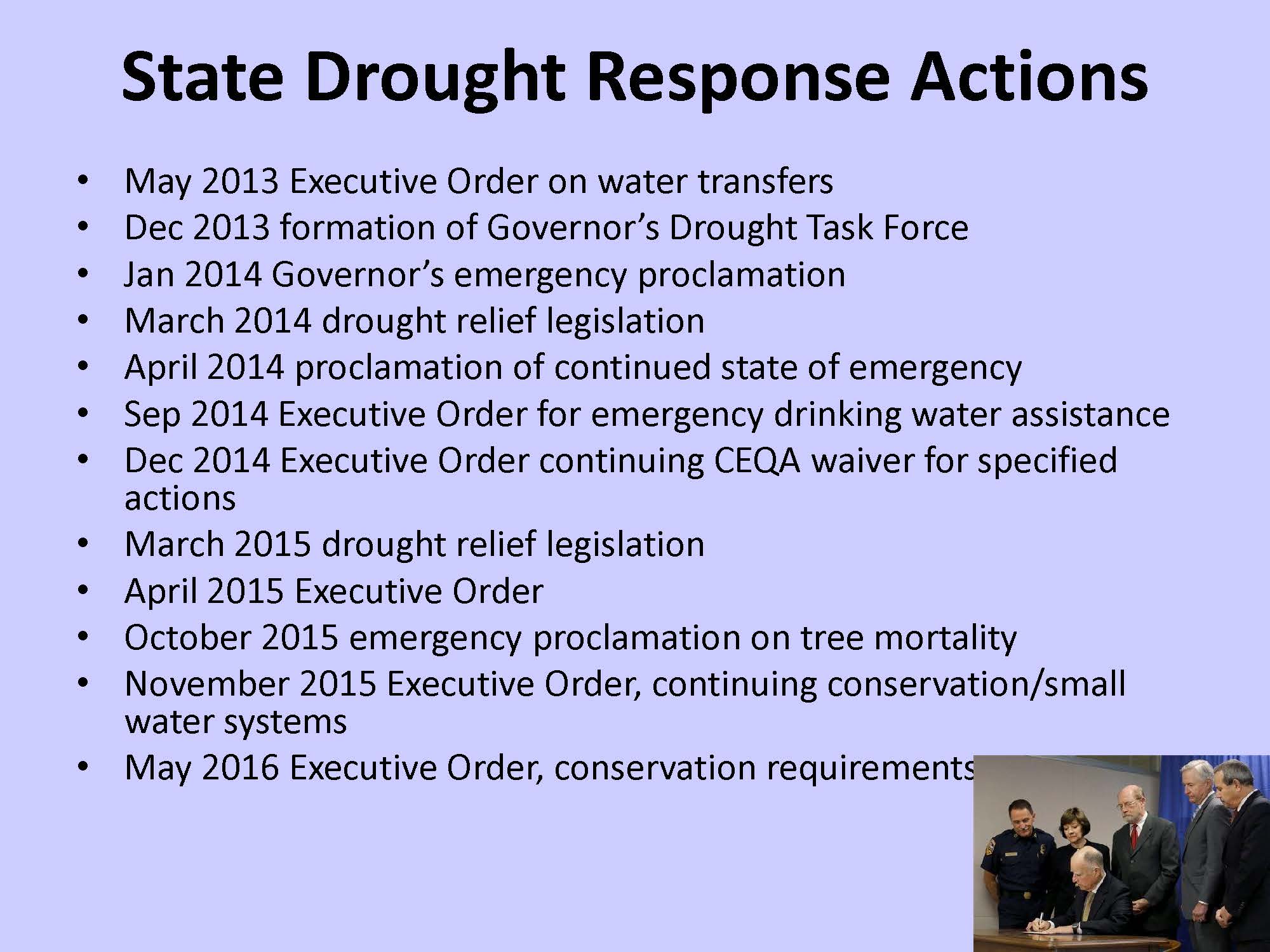If another metric of the severity of the drought is the number of executive orders and emergency proclamations that have been issued, we’ve set another record, said Ms. Jones. “None of our historical droughts have had more emergency proclamations or executive orders than this one,” she said. “There has been a very high level of state response, including provision of emergency funding and a couple special funding bills from the legislature in that regard, so many, many activities going on at the state government level. The Governor’s drought task force continues to meet on a regular basis to talk about how impacts are emerging and changing, hopefully some of them being resolved, and what do we have to think about in terms of this summer and then going forward into what 2017 could look like.”