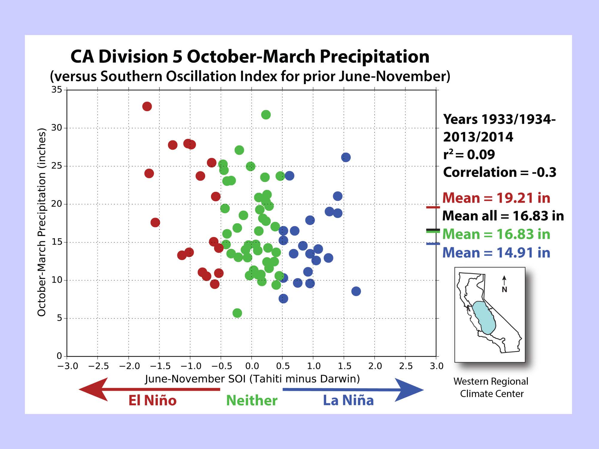 Just to illustrate the point, she presented a graph of winter precipitation as related to El Nino, neutral, and La Nina years for the San Joaquin Valley. “La Nina dots are in blue and that kind of looks like a shotgun plot between El Nino, neutral, and La Nina, so this is why you really can’t take this to the bank and use this to make major investment decisions.”