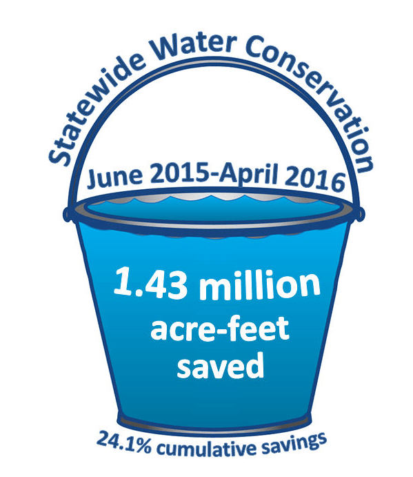- Cumulative statewide percent reduction for June 2015 to April 2016 (eleven months) was 24.1 percent, which equates to 1,431,101 acre-feet (466.3 billion gallons).