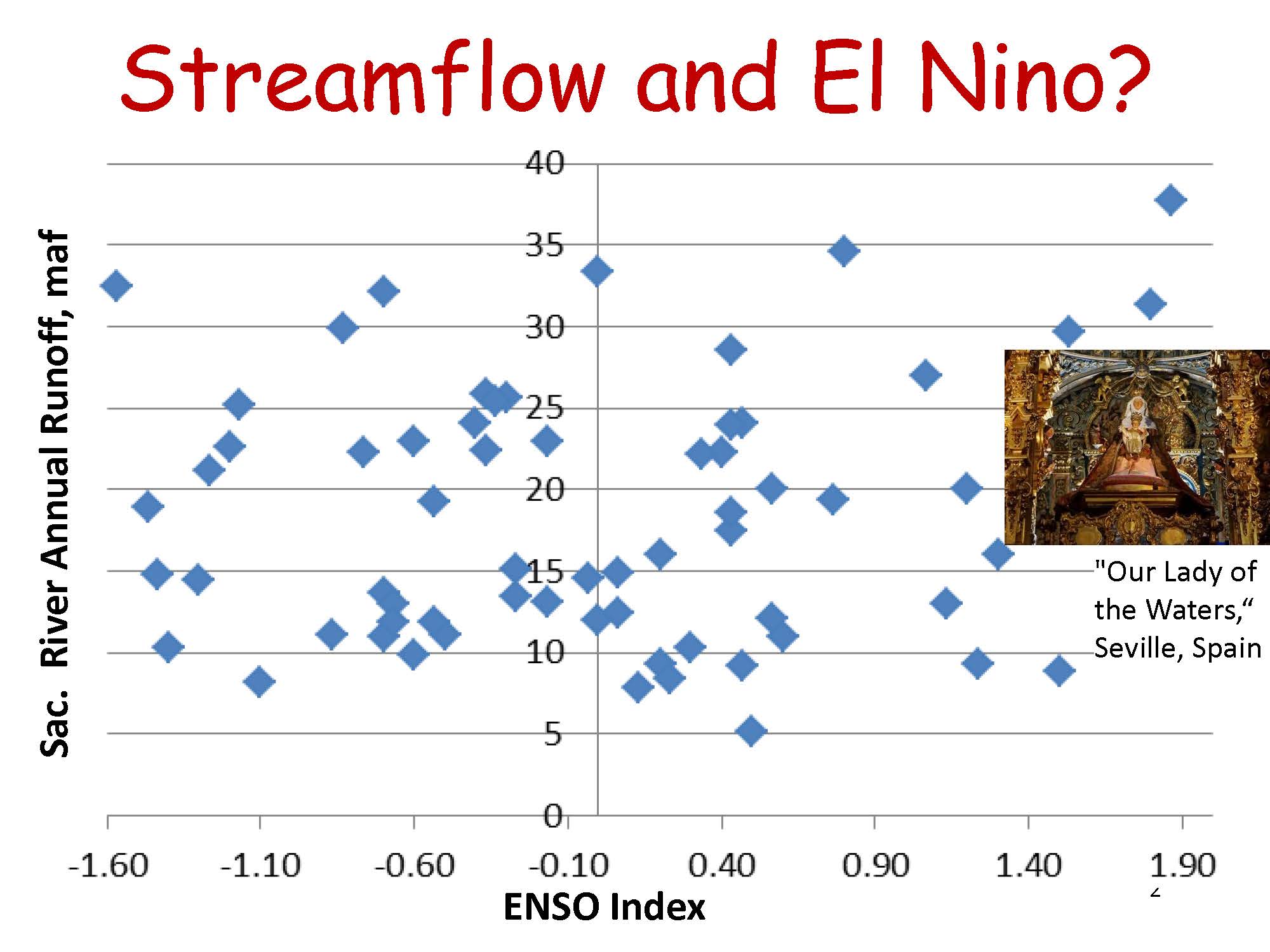 “Godzilla El Nino, where did it go? I went back and looked at the last 50 years of Sacramento River runoff and the El Nino Index, and what can you get out of 50 years of history with El Nino and runoff from the Sacramento Basin? Not much. So I show it to you now to remind you, next time your climatologist comes and tells you how great it’s going to be that that’s not going to be a perfect prediction, and they understand that, too.”