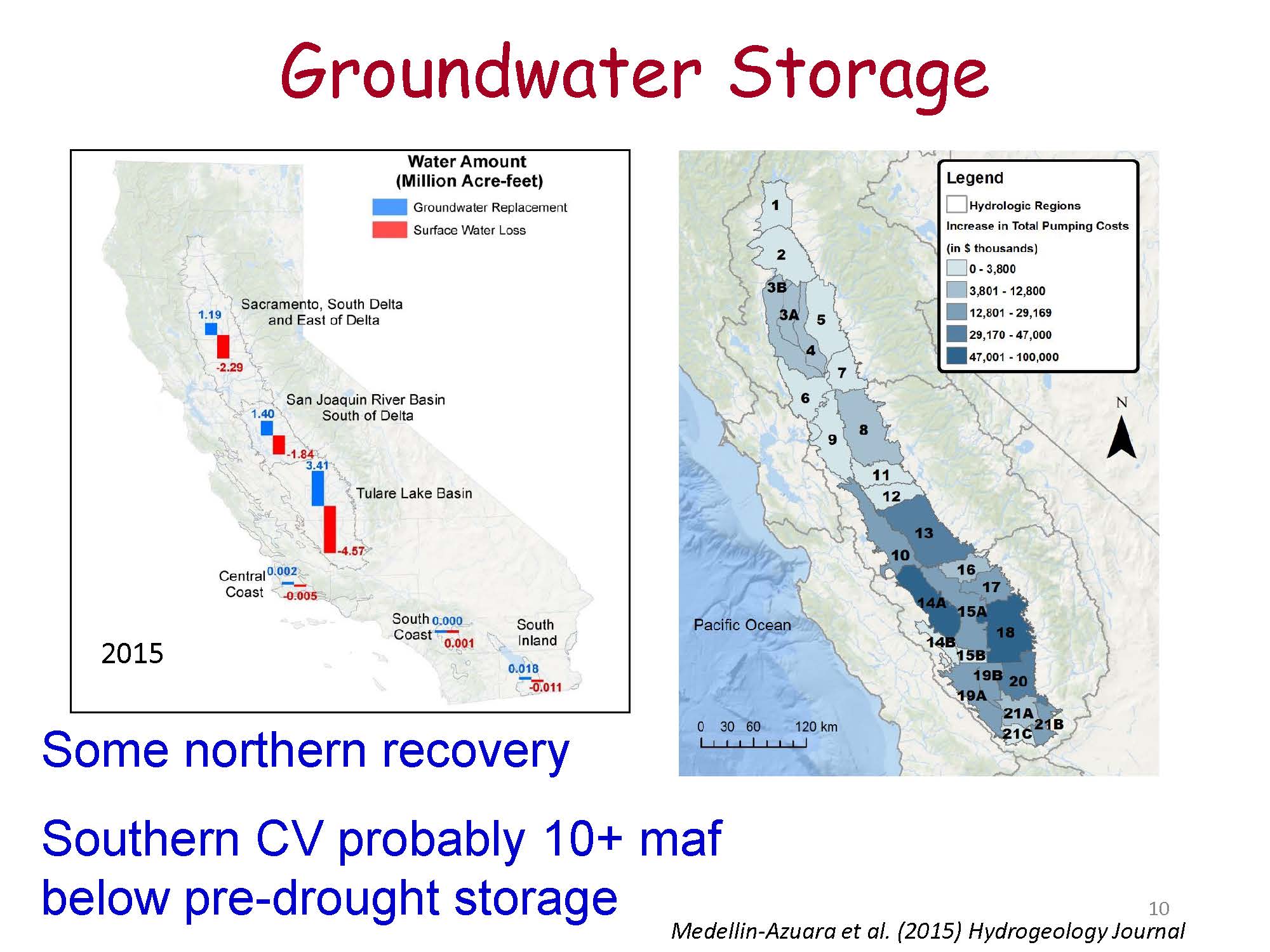 With respect to groundwater storage, there was enough precipitation in the northern part of the state that the Sacramento Basin is likely to be recovering pretty well, he said. “In the southern Central Valley, which didn’t receive as much precipitation, I would guess there is still on the order of 10 million acre foot or so of draw down still accumulating from the drought, so we’re still well below pre-drought levels for groundwater storage south of the Delta,” said Dr. Lund. “Most of that is usually almost always the Tulare Basin.”