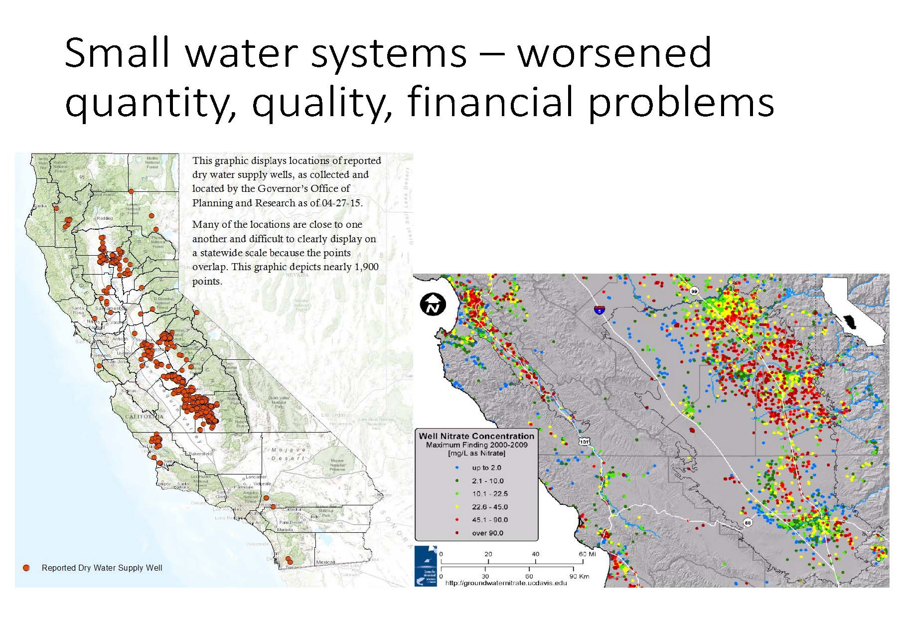 The urban areas have done pretty well through the drought with a few exceptions, Dr. Lund noted. “The small water systems have been seeing the worst of this drought. In terms of quantity, quality, and financial problems, they’re always in a more fragile situation, particularly in the rural areas where they have water quality problems as well.”