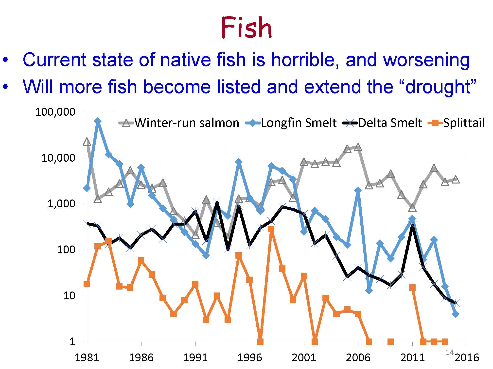 Dr. Lund then presented a graph of fish abundance in the Delta, pointing out that the fish are in horrible shape. “Things are really pretty bad for these fish,” he said. “One of my worries is that just like the 88-92 drought, following that drought, the fish were in such bad shape that we ended up listing quite a few of them as endangered. If that same thing happens again, we can look forward to a very long tail on this drought in terms of curtailments on water delivery, so I think this is something we should really pay attention to.”