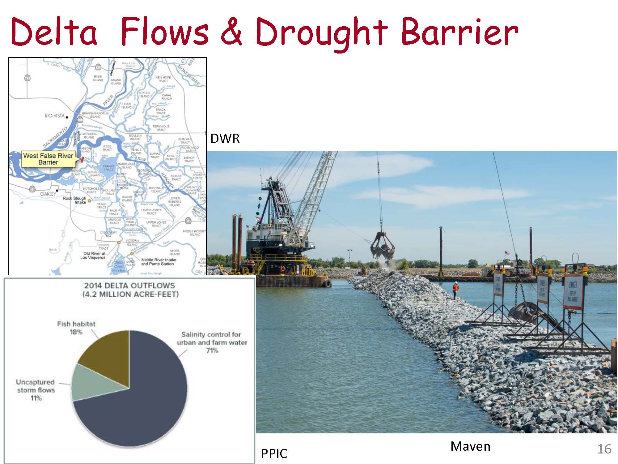 The drought barrier that DWR put in during 2015 was helpful. “It was our experience back in 2014, we had some periods of time where tides were very high in a couple of months of the summer, and what was happening was that those high tides would bring some salts into the Delta, and we had to have a little higher outflows to deal with that. The thinking was with just a rock barrier across the channel at the False River, that would maybe not necessarily keep salts, you know, pushed well out to the bay but would at least keep these intermittent times where salts would come riding in quite a ways into the delta with the higher tide cycles with the higher energies. The good news is that it really did help us kind of even out the outflow requirements for the summer and allowed the projects to operate with a little less outflow and overall be able to move at least some water with our limited water we had upstream.”