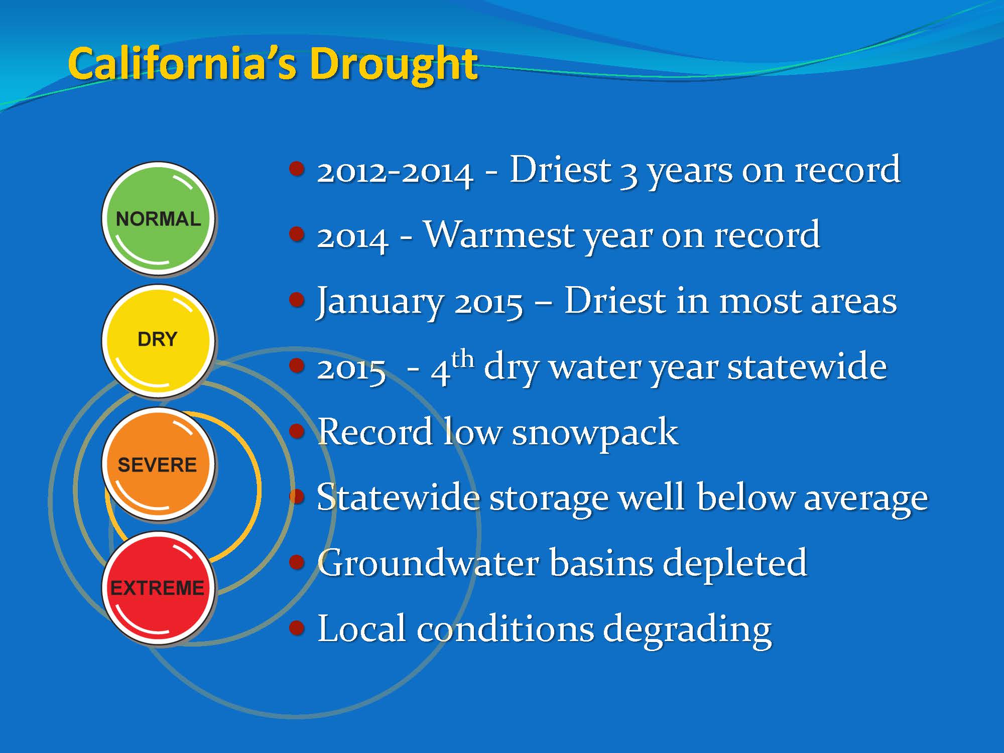 Taryn Ravazzini said she would be discussing the state of the state’s water system from the Department’s and resident’s point of view. She presented a slide with a list of drought facts, noting that there’s no universal definition for a drought. “One of the things I find fascinating about California is that our state of 39 million people with its $2 trillion economy subsists largely on the bounty of five or six winter storms a year,” she said. “The years 2012 to 2014 were the driest three years on record; 2014 was the warmest year on record, so with that, we have a couple of issues of record low snowpack. Statewide storage is well below average, groundwater basins have been or are being depleted, and of course, local conditions are degrading.”