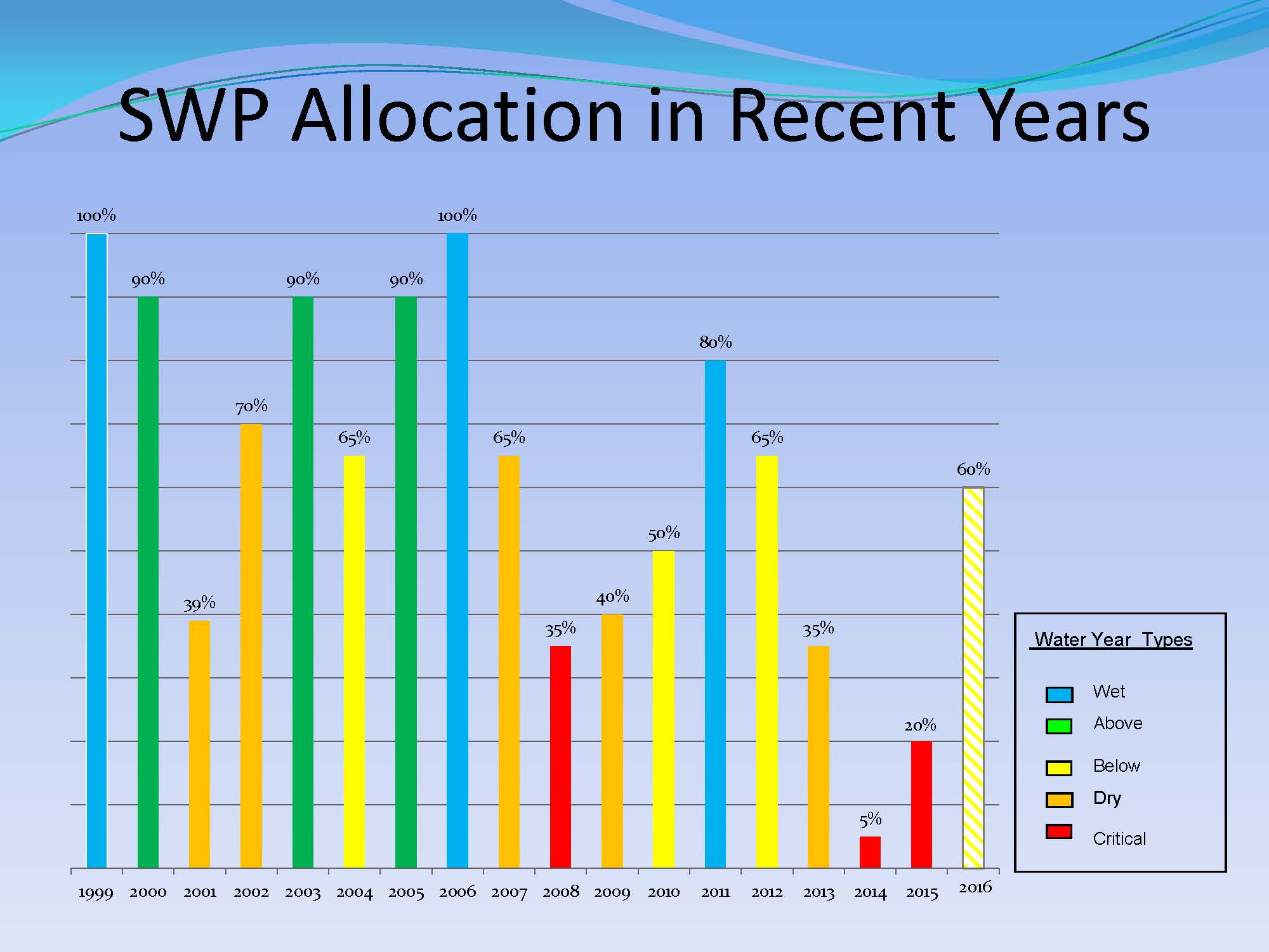 “In terms of project deliveries, for the north of the Delta, both state and federal projects are delivering 100%; south of the Delta, 100% for the exchange contractors and refuges and the Contra Costa Water District, 50% for Friant contracts, which had essentially 0 the last couple of years, and 5% for south of the Delta, non-exchange contractors. The State Water Project 60% of full delivery. So again, hugely better than last year and quite a bit better than 2014 as well.”