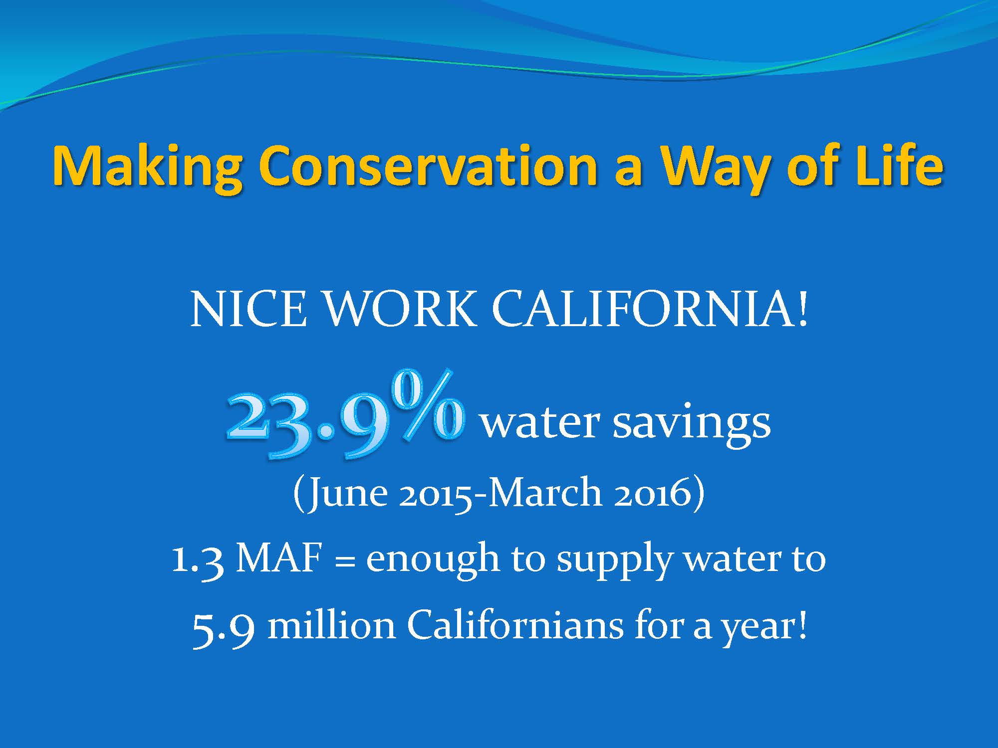Ms. Ravazzini noted that Californians conserved water at a rate of 23.9% from June 2015 through March 2016, a savings of 1.3 million acre-feet – enough water to supply 5.9 million Californians for a year. “Statewide conservation rates may drop with the wet season drawing to a close, so we have to be conscious of that,” she said. “Fortunately, a recent poll showed that 75% of Californians still view the drought as very serious and the need to conserve as something they will continue to do, but permanent changes to keep saving water must happen. We need to continue fixing leaks, taking shorter showers, decreasing our landscape irrigation, switching to low-flow plumbing, and appreciate the native drought-resistant plants that we have here in California.”