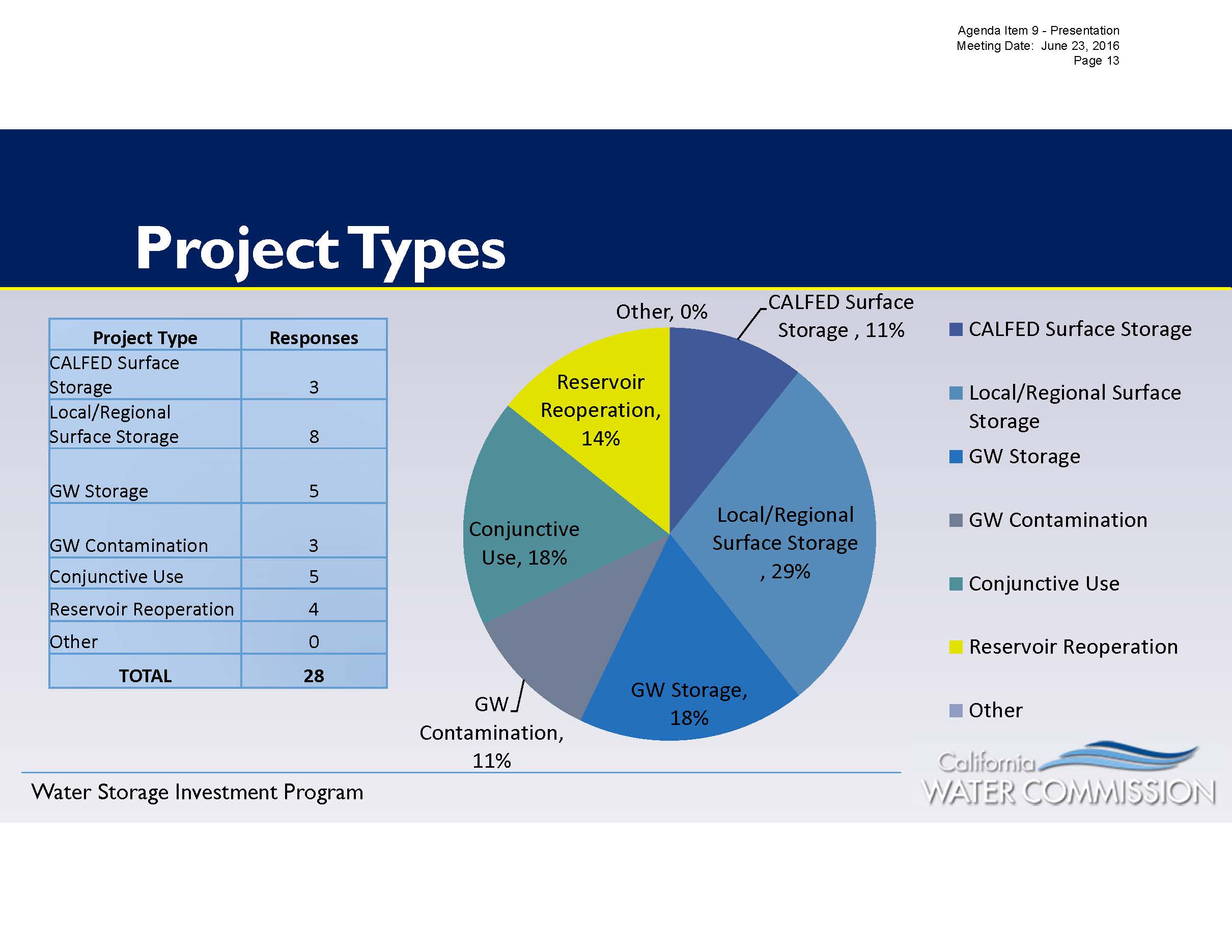 Of the 28, the breakdown is such: 29% regional surface storage, 18% conjunctive use projects, 18% groundwater storage projects, 14% reservoir reoperation projects, 11% groundwater contamination projects, and 11% CalFed projects. Claimed public benefits in the concept papers included Delta ecosystem benefits, flow improvements, Delta outflow, water quality improvements, decreased fish entrainment, habitat improvements, flow, water quality, and habitat improvements in tributaries.