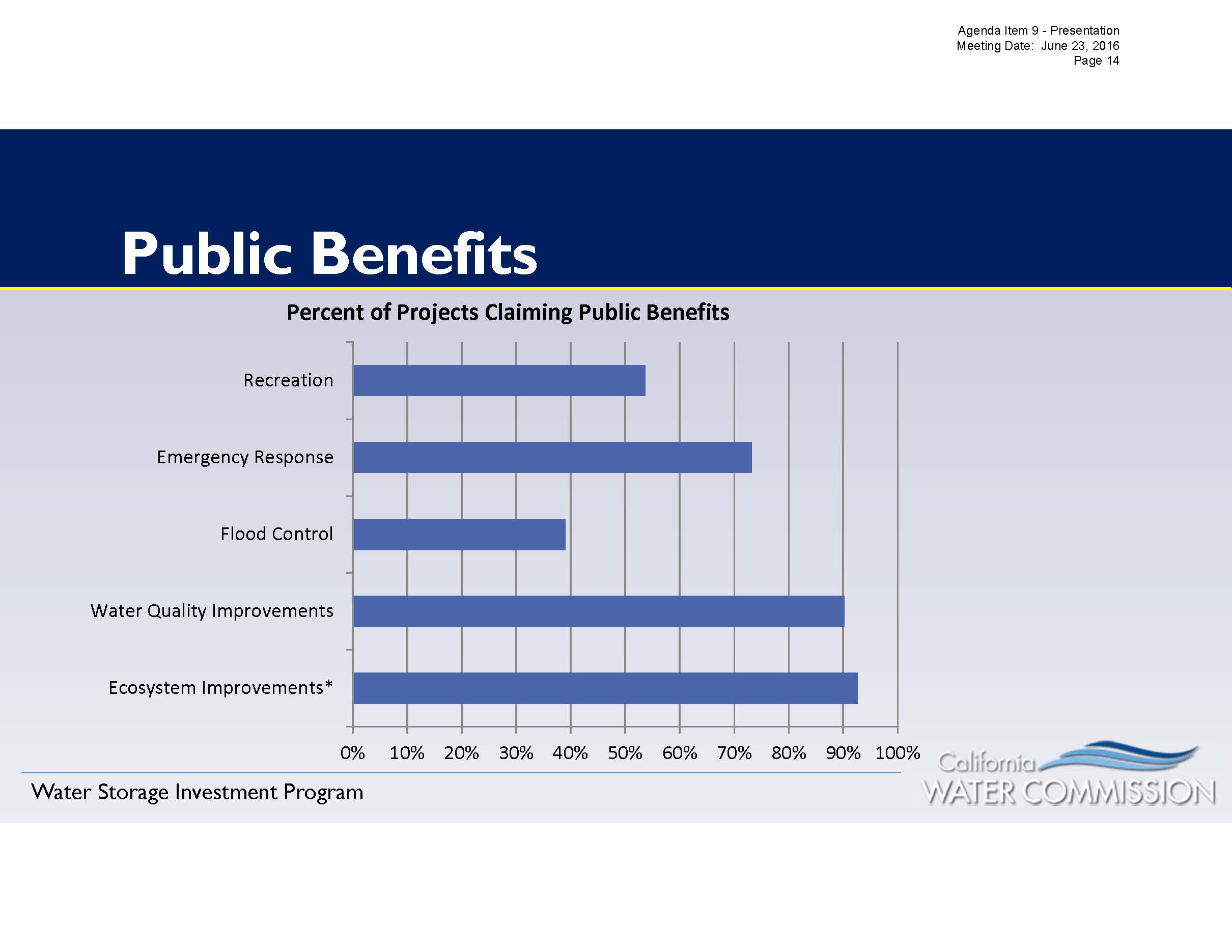 Chapter 8 of Proposition 1 continuously appropriates $2.7 billion to the Commission for public benefits associated with water storage projects that improve the operation of the state water system, are cost effective, and provide a net improvement in ecosystem and water quality conditions. The Commission can only provide funding for public benefits, which is described in the statute as ecosystem, water quality, flood control, emergency response, and recreation. “You will notice that water storage is not on that list,” Mr. Yun pointed out.