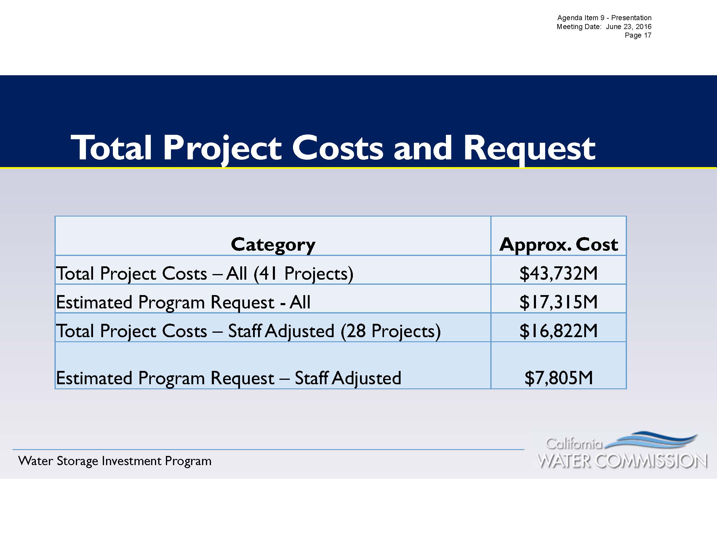Mr. Yun then presented a slide with the total project costs and requests. “We have $2.7 billion, but after you deduct bond servicing and the operational costs for the program, it’s probably more like $2.5 billion to grant, and our estimated requests is $17 billion,” he said. “A little bit oversubscribed. Cut that down to the 28 concept papers, and we’re still looking at $7.8 billion. There’s going to be way more demand than we have funding for.”