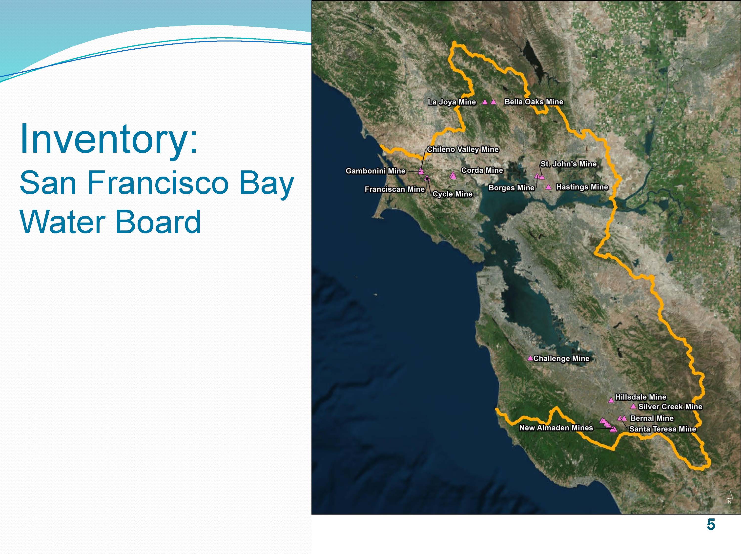 She presented a map of the mines in the San Francisco Bay Regional Water Board’s watershed, noting that it is a much smaller watershed compared to what the Central Valley Regional Water Board oversees, and so she was able to go out and personally inventory every mercury mine in their region, a task not possible for the Central Valley water board.
