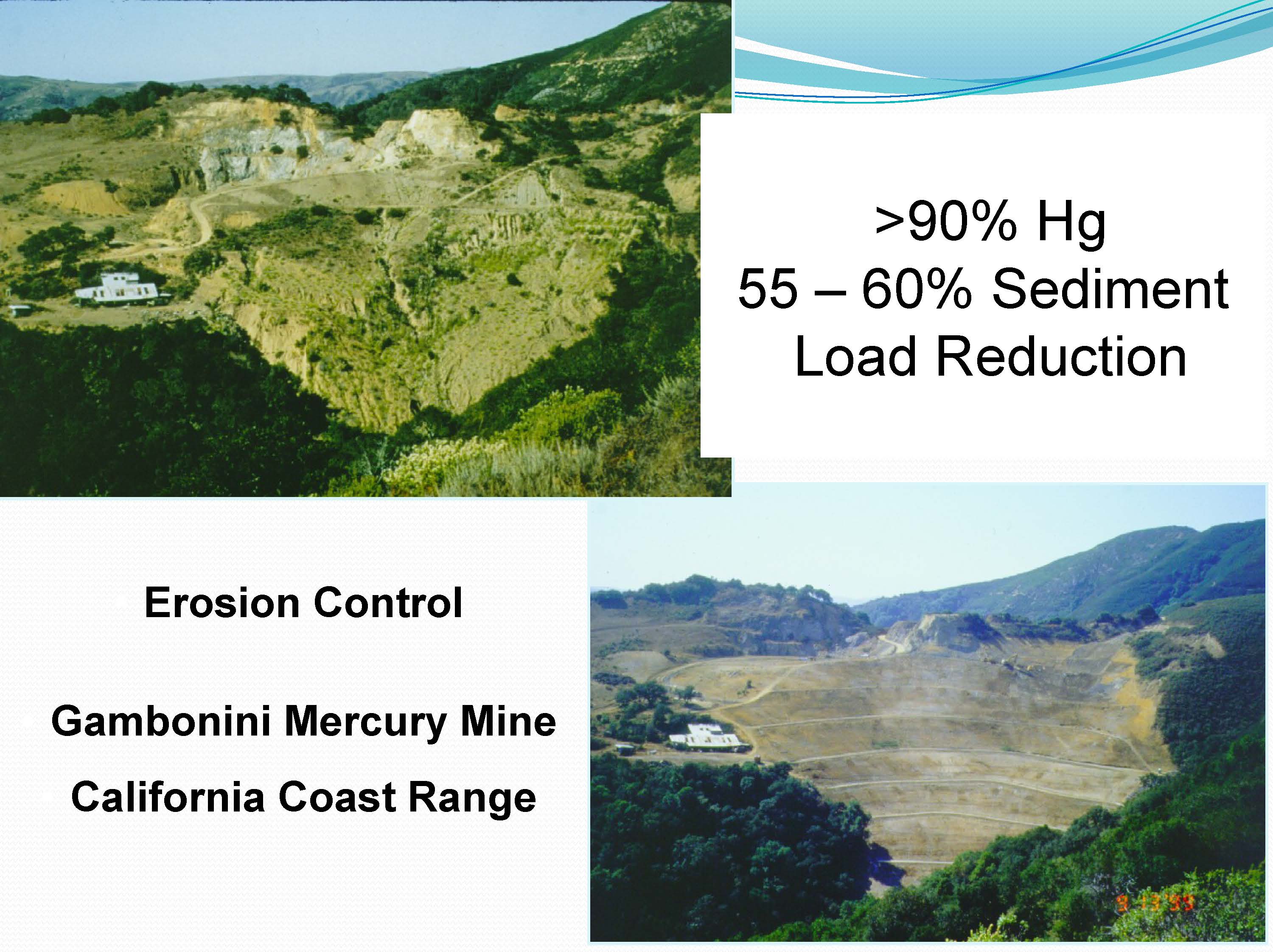 Ms. Austin emphasized that this was treated as an erosion control site, not a landfill with a liner and a cover. “The mining waste was simply moved around, compost was added, and a big native seed gathering and plants were germinated; lots of seeds were broadcast over it and the effectiveness if really terrific,” she said. “There’s greater than 90% load reduction in mercury leaving this site and greater than 55-60% sediment load reduction. I think that this is very translatable to other sites and I don’t think we need very many (if any) more of these kinds of detailed load studies of the effectiveness of remediation of this type. And furthermore, I would argue that where a landfill is built with a liner and a cap, we’re going to get even greater than 90% mercury load reduction.”