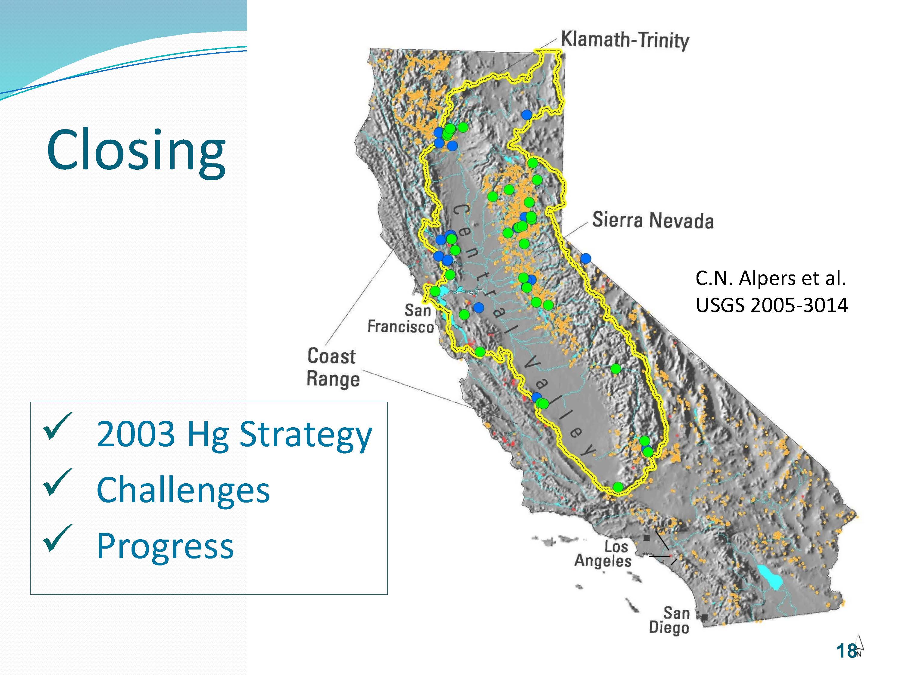 The core components of the 2003 mercury strategy were to identify the mine sites; prioritize them for cleanup or remediation; pilot test remedial technologies; implement or remediate; and then to measure performance. “I like this question in my work, because I’m a remediation engineer who would like to leave a positive impact when I’m gone,” she said. “So where might mine remediation enable measurable and timely fish methylmercury reductions is a key question for us.”