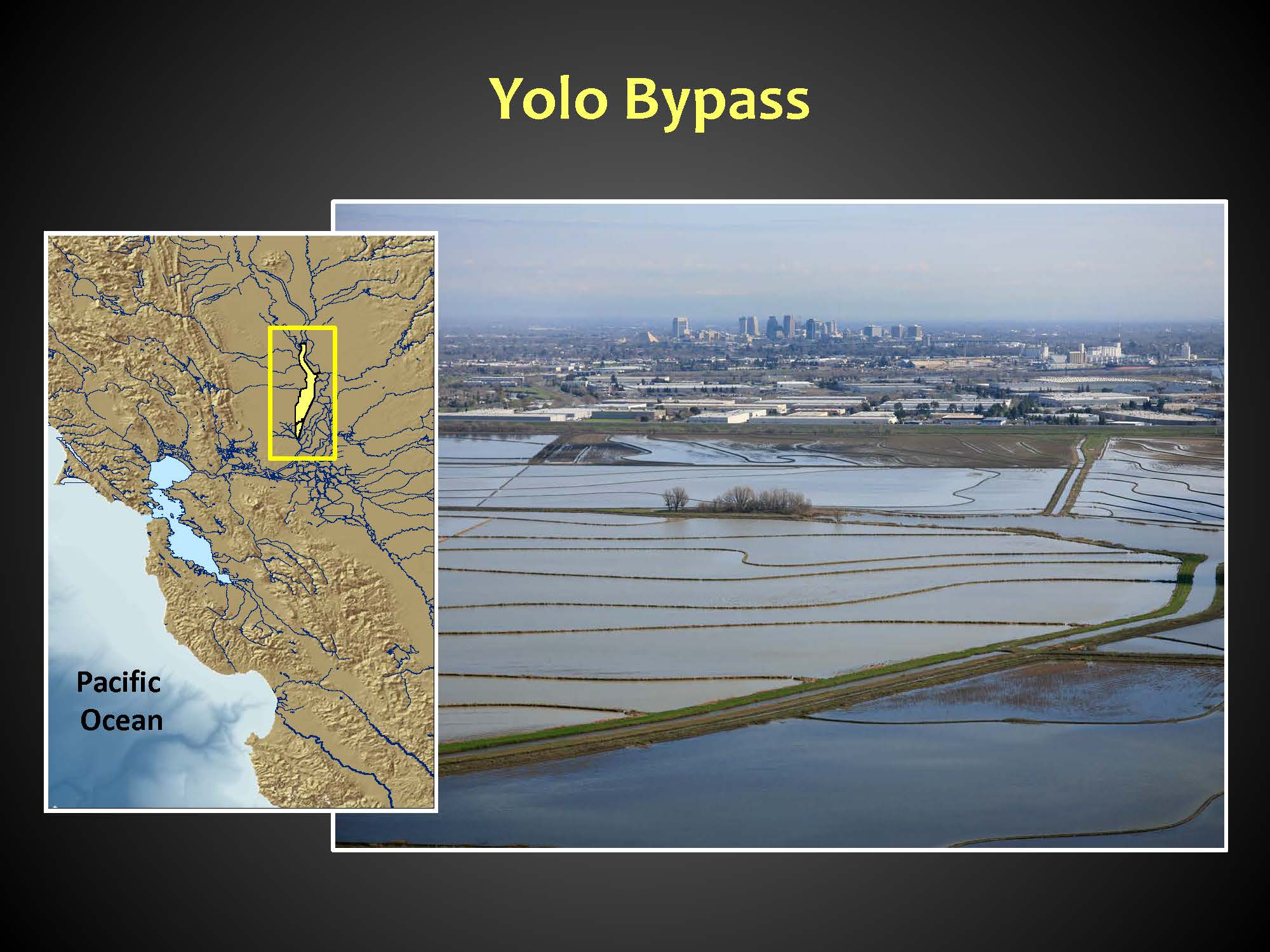 The Yolo Bypass is part of the flood control system that was implemented in the early 20th century to control floods, but it functions quite differently than levees and dams, she said. “It acts as something of a pressure relief valve for the Sacramento River, allowing water to flow down into it for flood control,” she said. “The way that it works is the northern end of the bypass is the Fremont Weir, a low concrete two-mile long sill, and when the Sacramento River reaches 33 1/3 feet in stage, water begins spilling over that sill into the Yolo Bypass. When overtopping occurs in the Yolo Bypass, anything that’s transiting through the Sacramento River, like juvenile salmon, has the opportunity to enter the floodplain and take advantage of the habitats that are out there.”