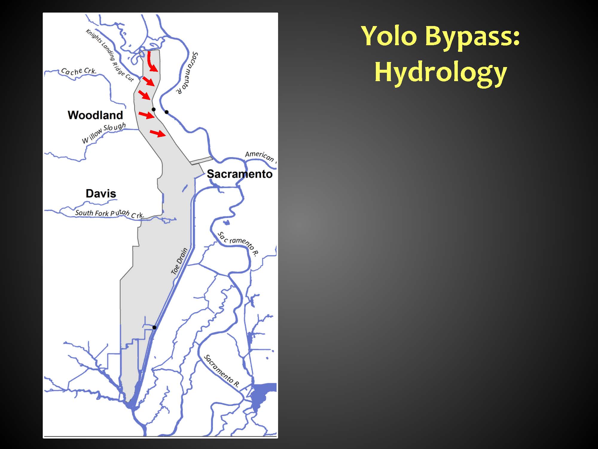 The Yolo Bypass has four tributaries that enter from the western side, which irrigate agricultural lands within the Yolo Bypass during the growing season. These tributaries can cause some localized flooding, but this does not bring an influx of salmon in as the there is only one small population of salmon in one of the tributaries, Putah Creek.