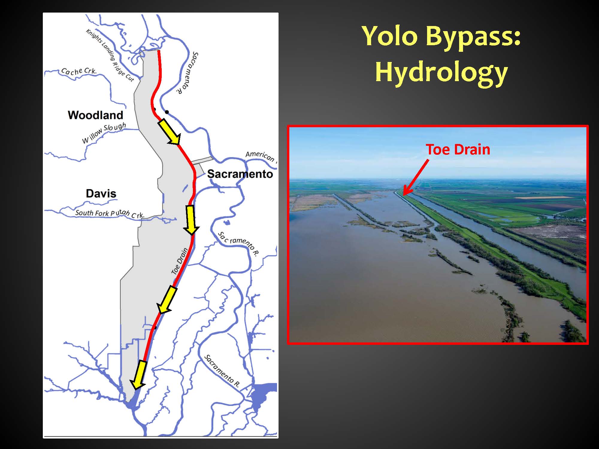 Just as it is engineered to flood, the Yolo Bypass is also engineered to drain relatively quickly and efficiently, Ms. Takata noted. “The whole bypass is graded to the southeast, so as water comes over Fremont Weir, it then drains to the southeast to a perennial canal on the eastern side called the Toe Drain,” she said. “The Toe Drain drains the Yolo Bypass, channels the water down south, joins up with the Deep Water Ship Channel, and then eventually joins back up with the Sacramento River around Rio Vista.”