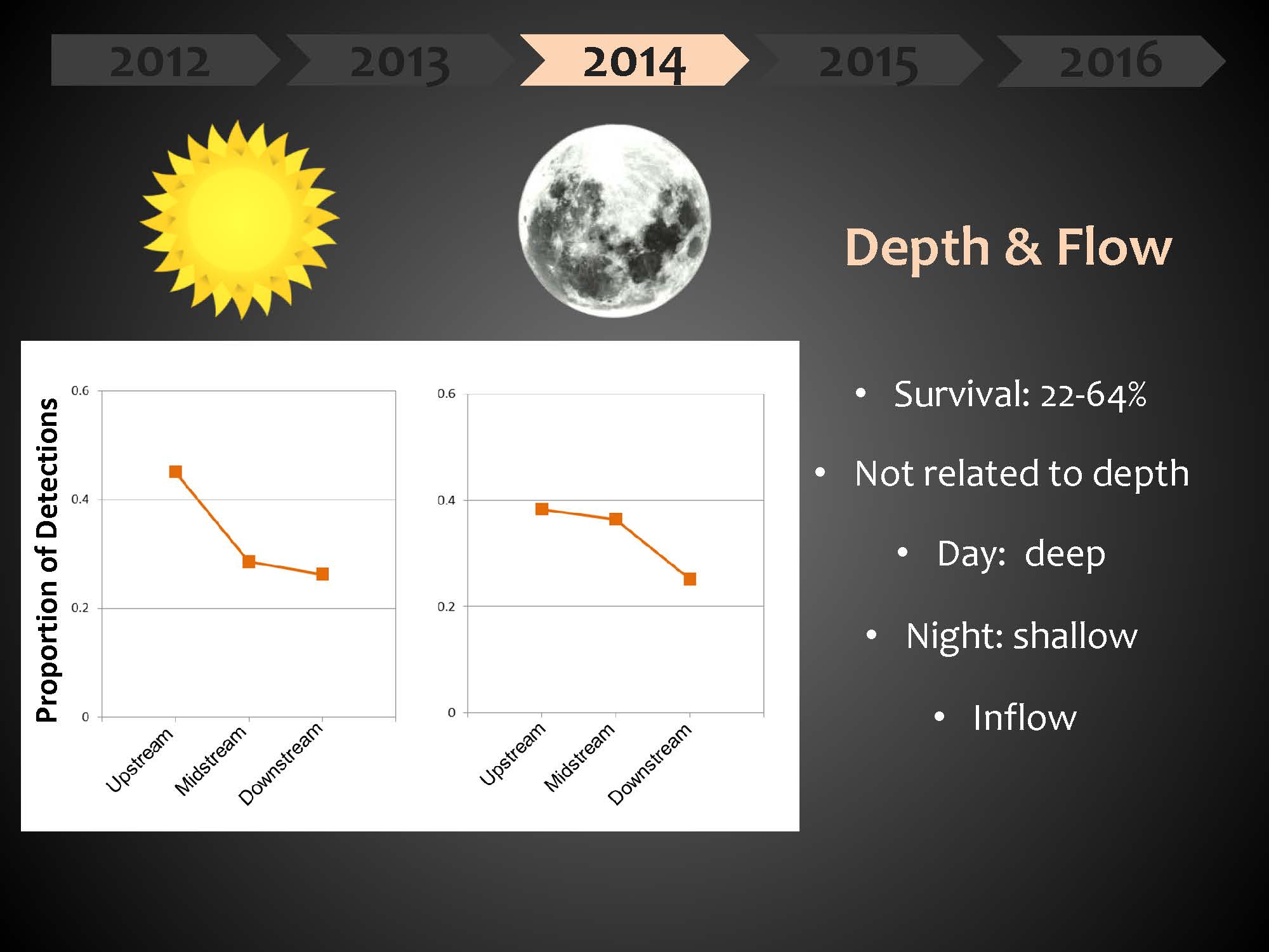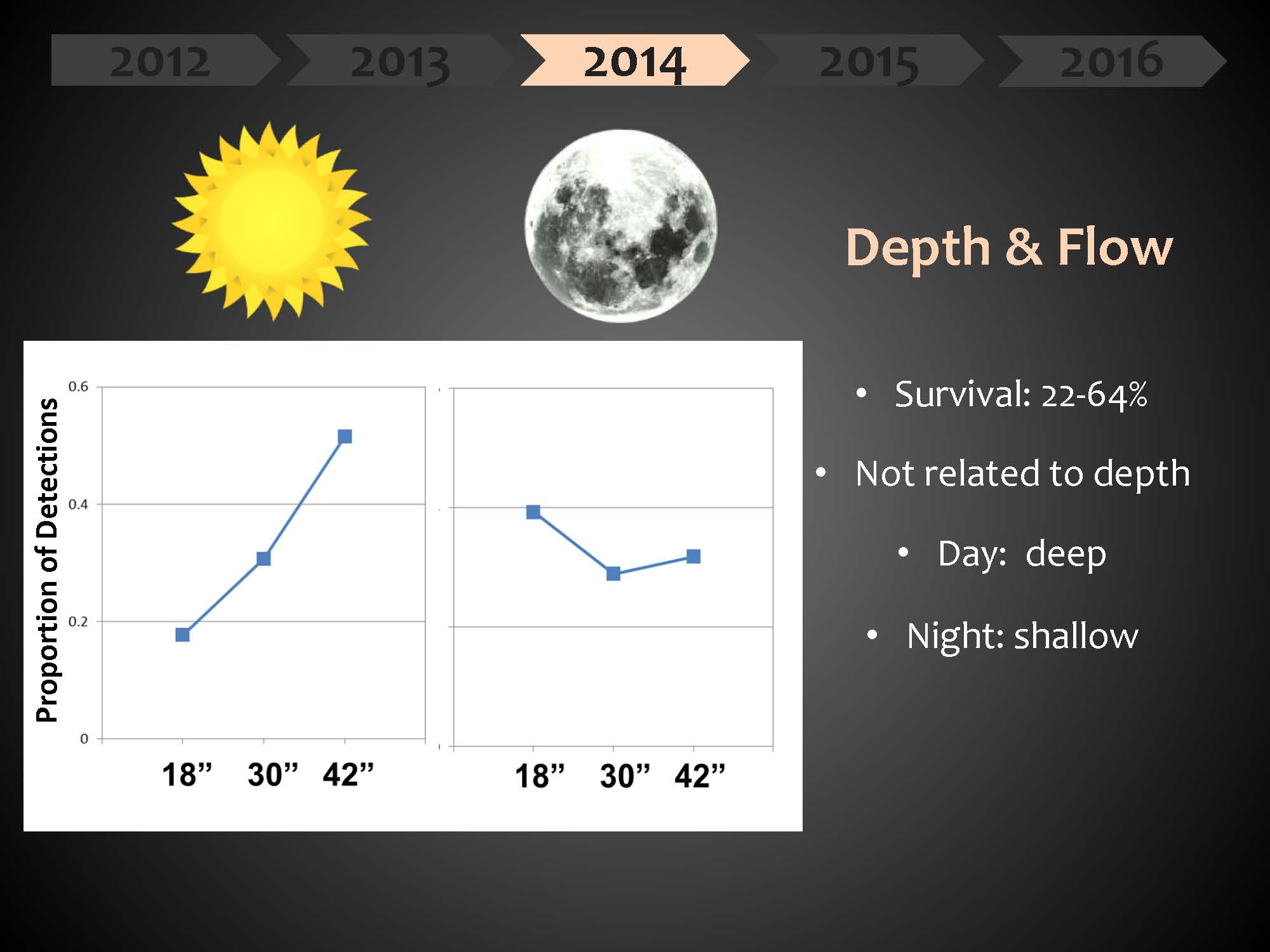 Given what they had learned about low survival and bird predation, and other studies that have suggested that fish tend to go to deeper areas to try and get away from predation, as well as some anecdotal observations of juvenile salmon from their fields, in 2014 they wanted to know whether depth and proximity to inflow made a difference for juvenile salmon.