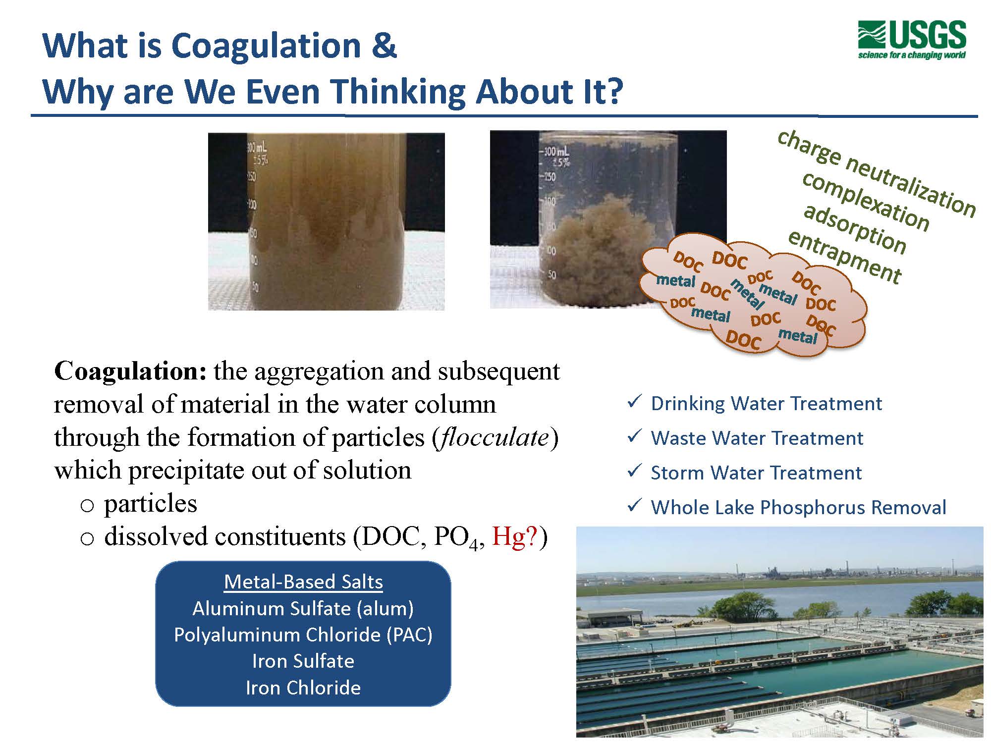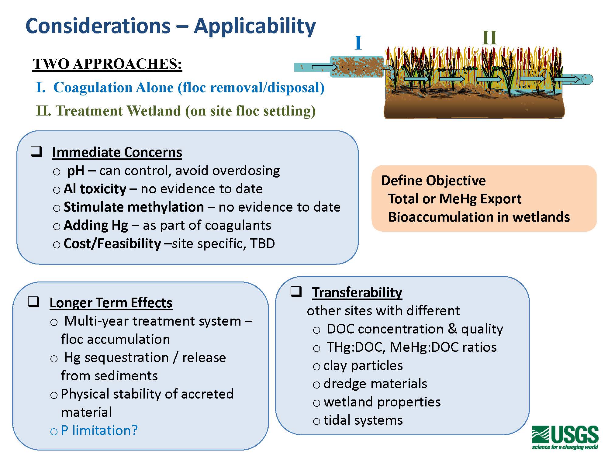 There are concerns about the coagulants themselves possibly having some mercury contamination in there, which is a concern for regulators, and the cost and feasibility is an issue, she said. Then the longer-term effects to see how stable this material is with respect to pulling mercury and DOC out of solution; there are also some concerns over the long-term about pulling too much phosphate out of a system, she said.