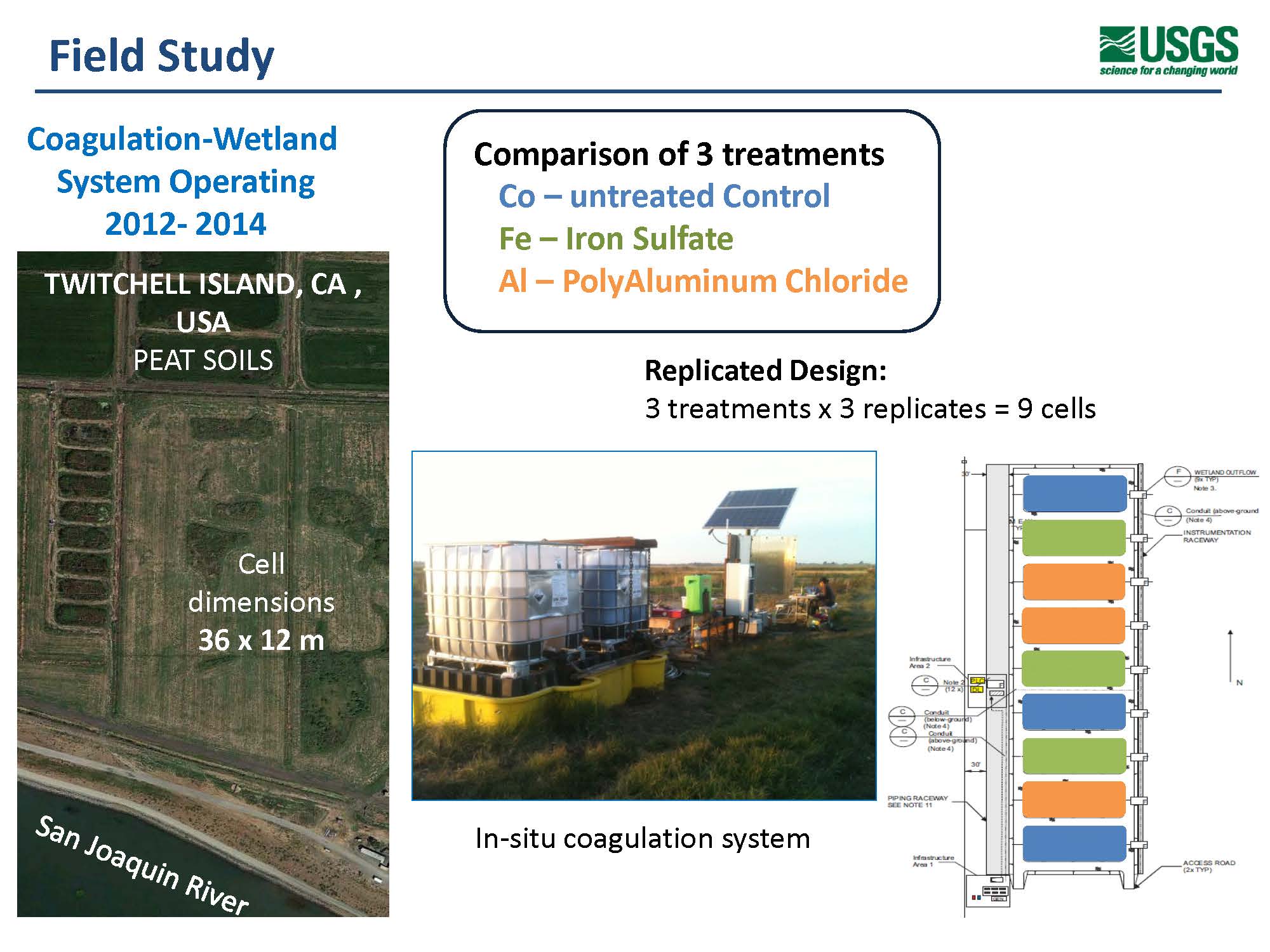 Dr. Kraus then turned to the field studies which occurred on Twitchell Island. There were nine cells 36×12; they are replicated cells of three treatments. Three cells were uncoagulated drainage water that was flowed through the wetlands cells (shown in blue on the diagram); the other cells were treated with coagulants, three with iron sulphate (shown in green) and three with polyaluminum chloride (shown in orange).