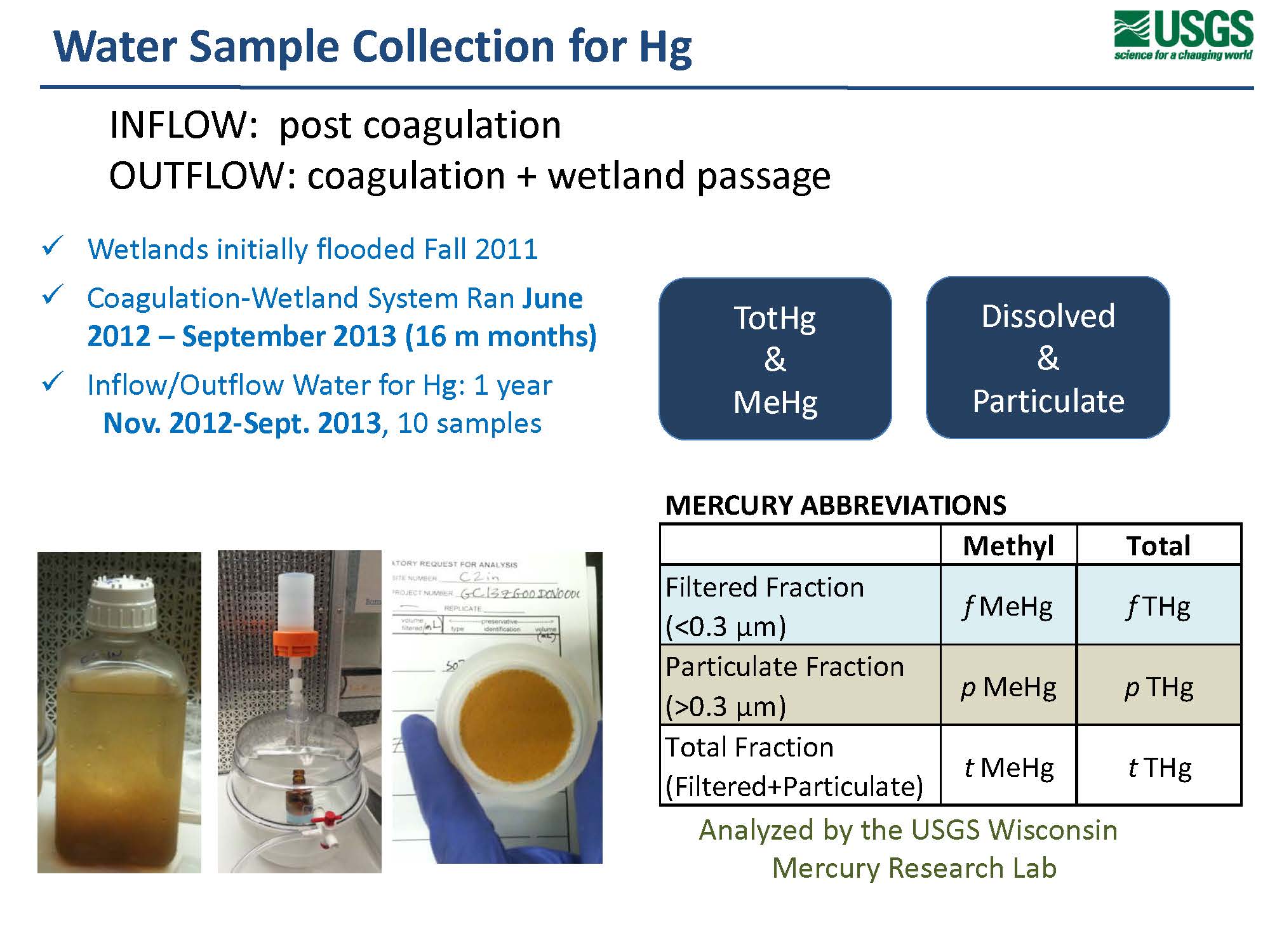 It was in 2009 when the stop work order came so they weren’t able to build the field site, so they took the opportunity to add mercury to the study, so there were some benefits to the stop work order, she said. In addition to looking at total and methyl mercury and how it’s impacted by coagulation, we also wanted to look at ecosystem effects, and bioavailability to organisms in these wetlands, she said.
