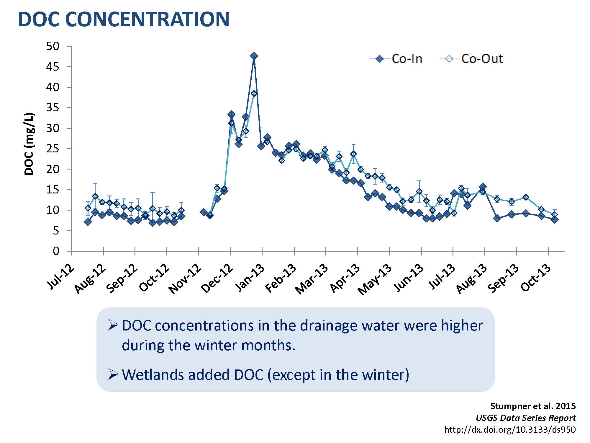 “I just want to show you the DOC concentrations in this system are higher in the winter because that’s when the rains come and the whole island floods up and there’s more drainage off of the peat material into these drainage ditches,” she said. “If you compare the filled lines (or the inflow) to the outflow lines (the unfilled symbols), you can see that there was DOC production due to passage through the wetlands, except in the colder winter months.”