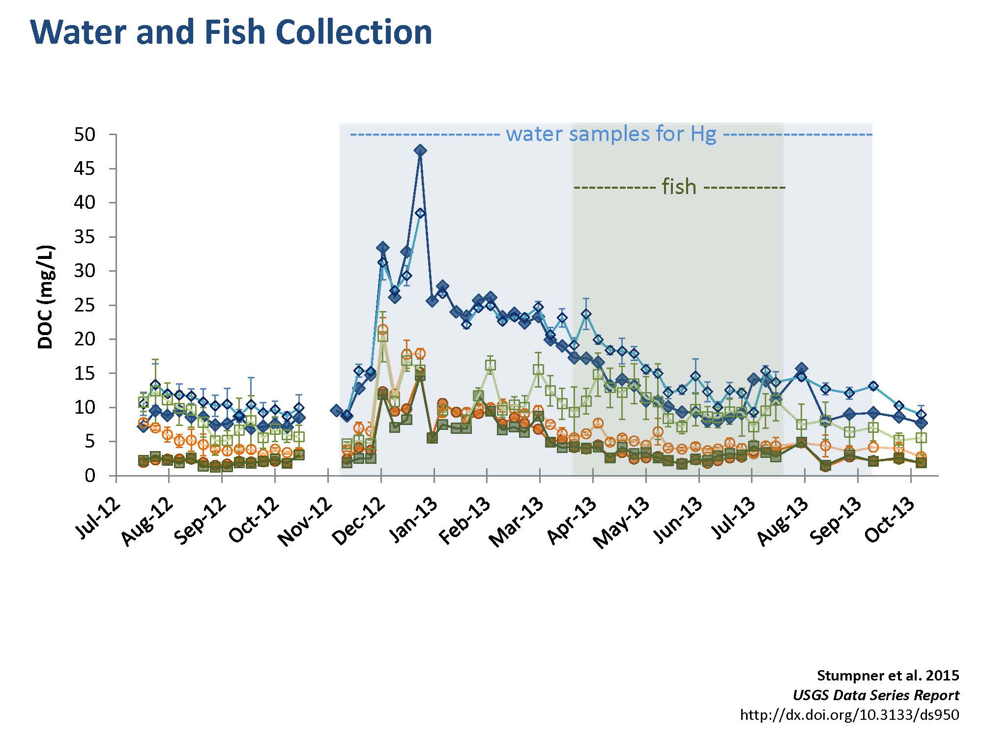 They didn’t really start collecting data until the fall of 2011; there is about 16 months where DOC concentration data was collected every week; there is also a one-year period where mercury samples were collected approximately monthly. “The way we collected and analyzed samples is that we collected a whole water sample, we filtered it, we’d send the filtered water and the filters to the Wisconsin Lab, and then we would sum those together total, so we had filtered, particulate, and then the sum of those two,” she explained.