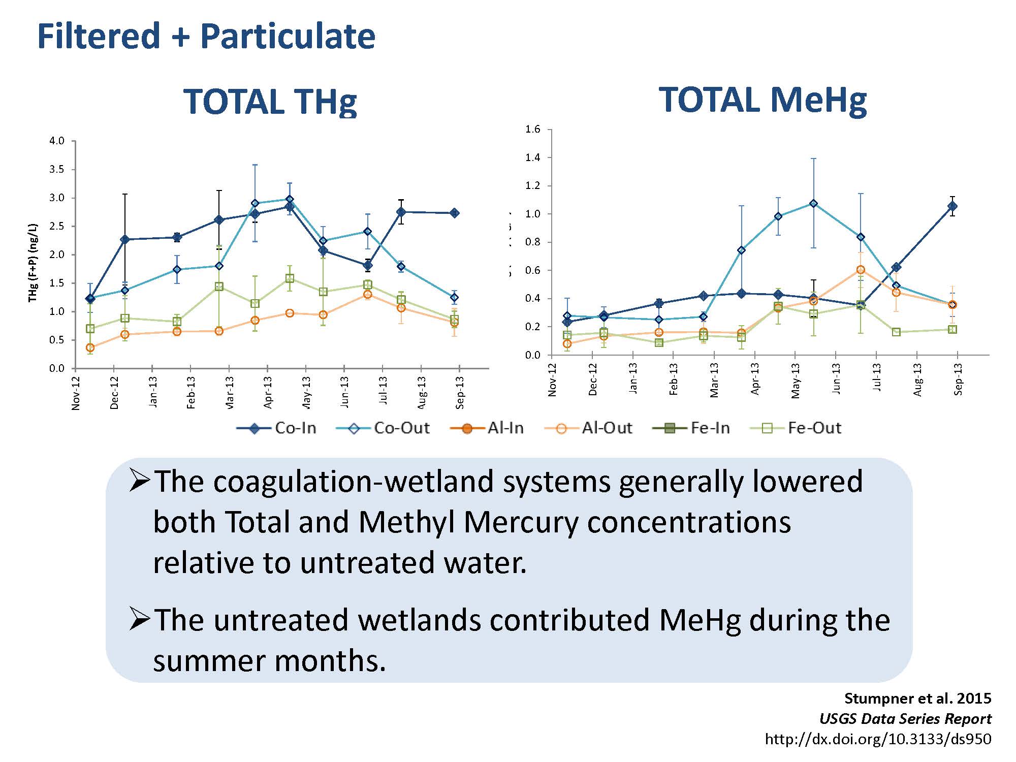 After the sample passes through the wetland, the particulate falls out of solution and settles to the bottom of the wetland. “In this case, in January, we did not see much production of total mercury due to passage through the wetlands, so we saw this large benefit to the coagulation wetland system. We transferred the mercury from the dissolved phase to the particulate phase and then those particles were retained in the wetlands.”