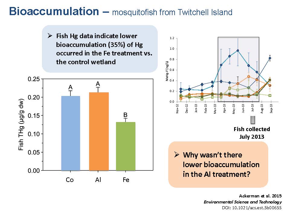 “We talk about loads, and we talk about concentrations, now we have to talk about biotic uptake because we would have predicted, based on the fact that there were lower methylmercury concentrations, and lower mercury concentrations in the treated wetlands, that there would be lower uptake in both the aluminum and the iron treated cells, but that’s not what we saw,” she pointed out.