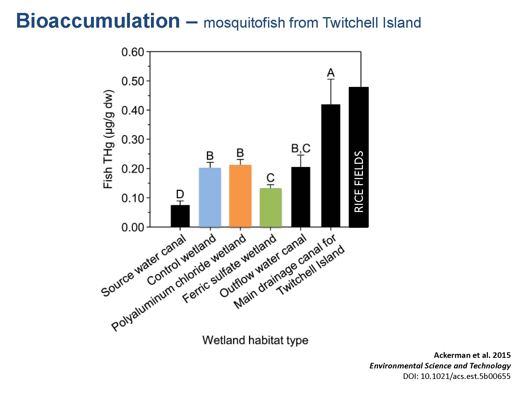 Dr. Kraus pointed out that fish were collected from a lot of other locations on Twitchell Island at the same time. “I think that’s really important, when we plot up what the fish are doing in our different wetland treatments, to put it in perspective,” she said, presenting a slide showing the bioaccumulation from the fish within the coagulant treatments relative to the fish pulled from other locations on Twitchell Island.