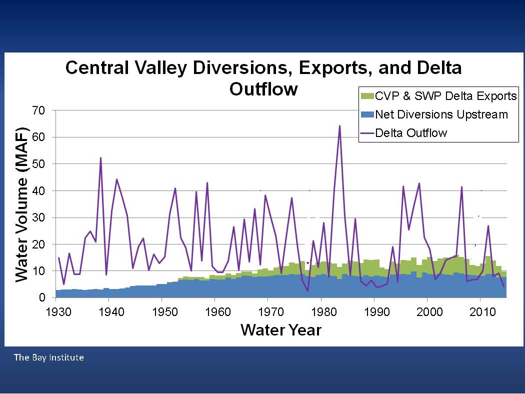 The graph on the right shows the patterns and volume of water coming out of the Delta from the 1930s to the present time; it also shows the amount of water that’s being diverted or withdrawn upstream of the Delta, and the amount of water that’s been exported from the water projects in the Delta.
