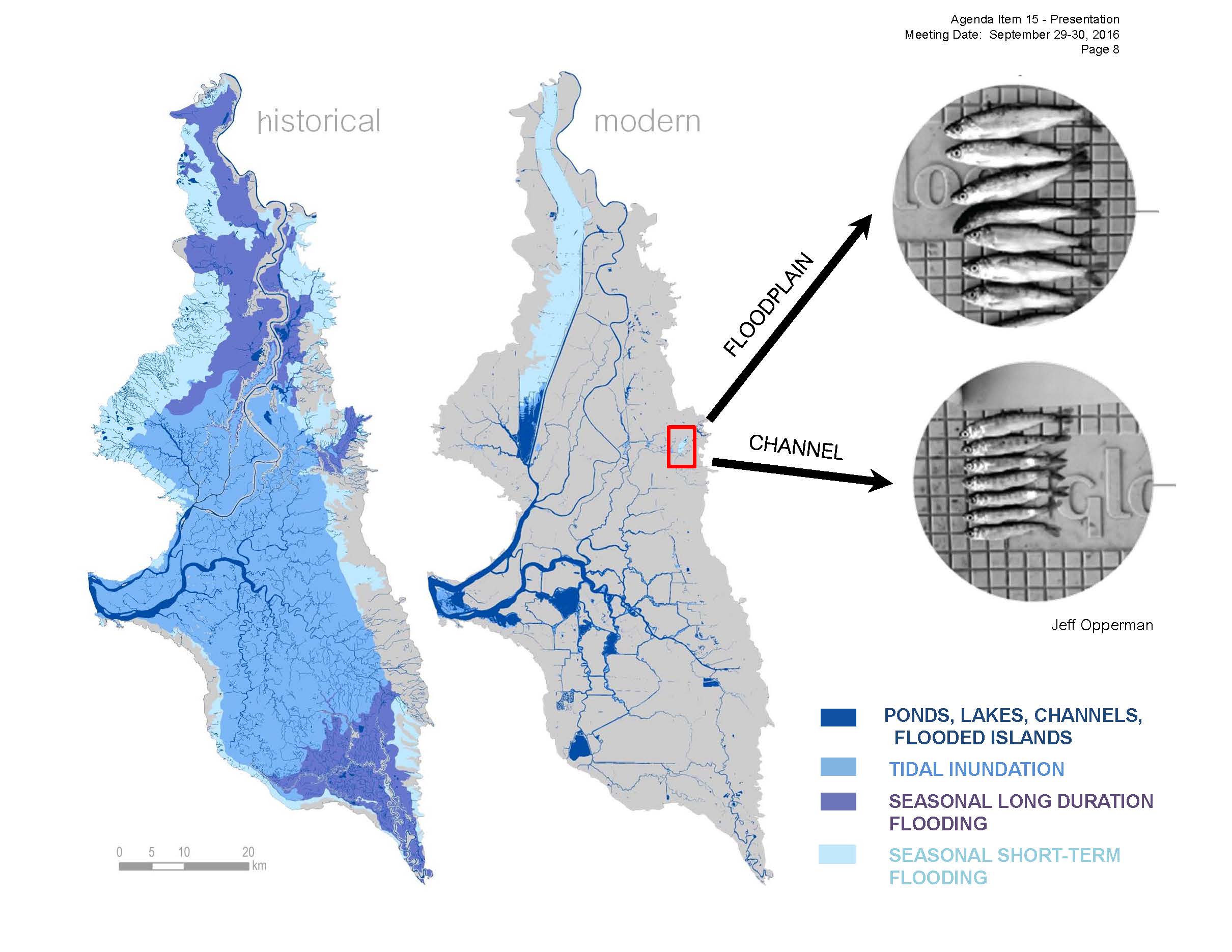 The floodplains of the Yolo Bypass and the Cosumnes River are two examples of success, she said. “Even though they somewhat pale in comparison to the historical function that used to be there, where we’ve made these floodplains, they are working,” she said. “Even though we’ve radically transformed the system, when we transform small pieces of it back, we see a lot of response. We know that fish that grow on a floodplain become very fat; they call them ‘floodplain fatties,’; our channel fish tend to be relatively small, and so I decided to call them river runts.”
