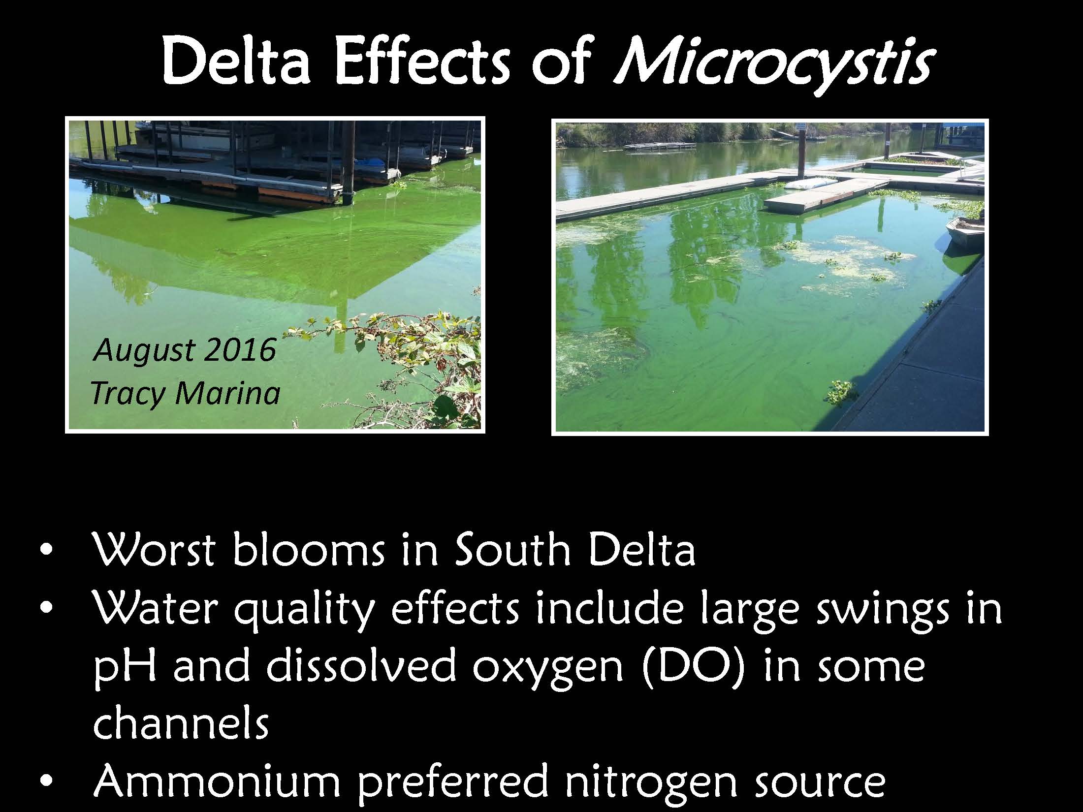 A variety of toxins are produced by these harmful algal blooms, including neurotoxins and levels of cyanotoxins that are significant concern. “The Delta effects from microcystis, the worst blooms this year have been in the south Delta. There’s some very clear water quality effects that come with these blooms, including large swings in pH and dissolved oxygen in some of the channels so there’s another one of the sags. Ammonium has been shown to be the preferred nitrogen source for these harmful algal blooms, so this issue of ammonium interacting with harmful algal blooms is another area that I think is deserving of some attention.”