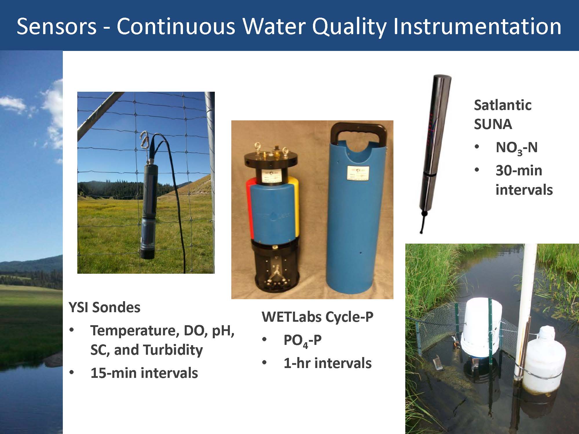 There are now continuous sensors for measuring phosphate and nitrate; sensors that measure algal pigments, some of the organic carbon components of water, and sensors that measure different aspects of the sediment composition and sediment types. There are many other sensors in the development stages.