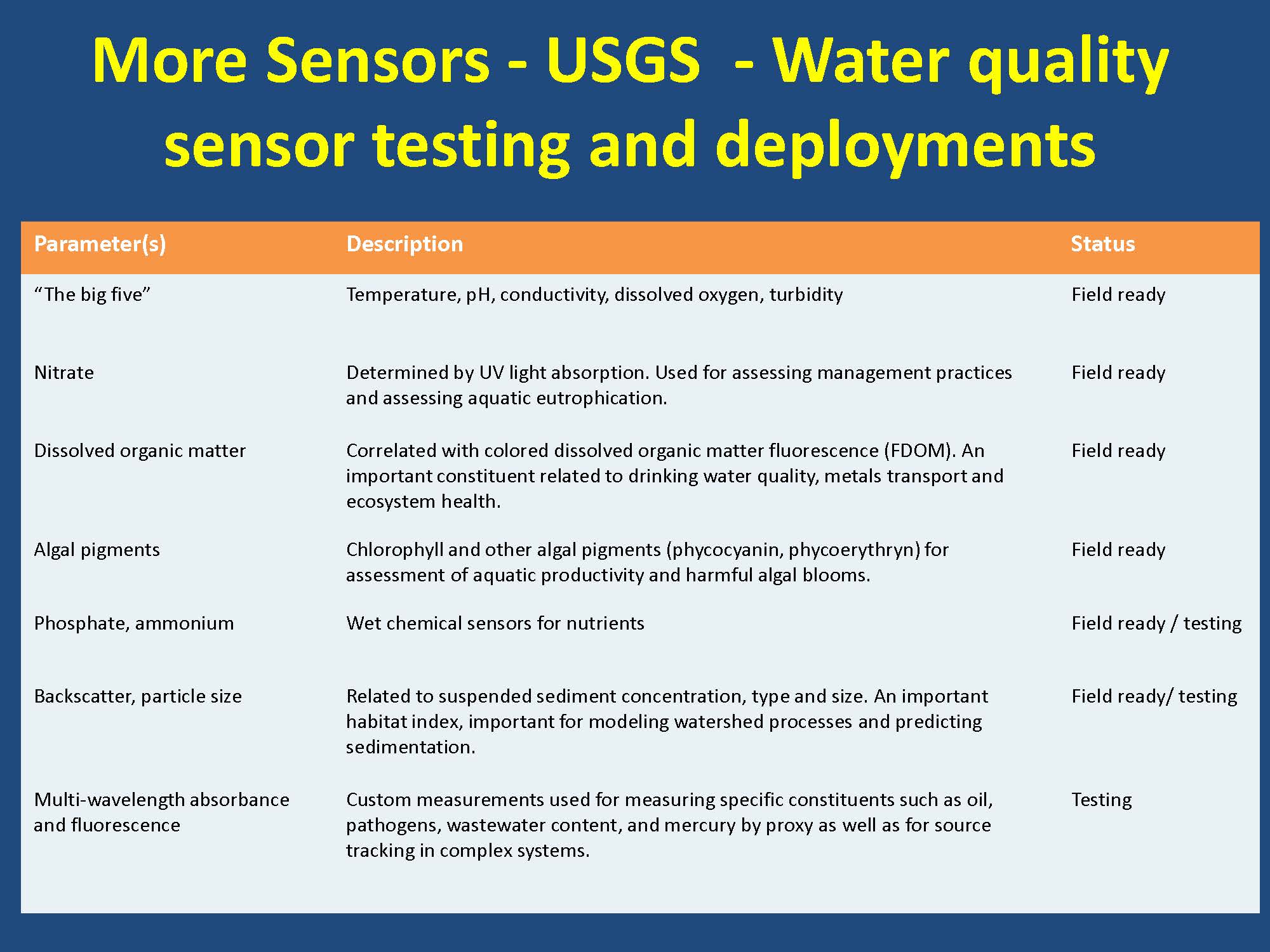 Dr. Dahm then turned to his last subject, sensors. He noted that one of his colleagues who is with the Monterey Bay Aquarium Research Institute has been developing sensors for the oceans which are starting to be used in freshwater systems now.