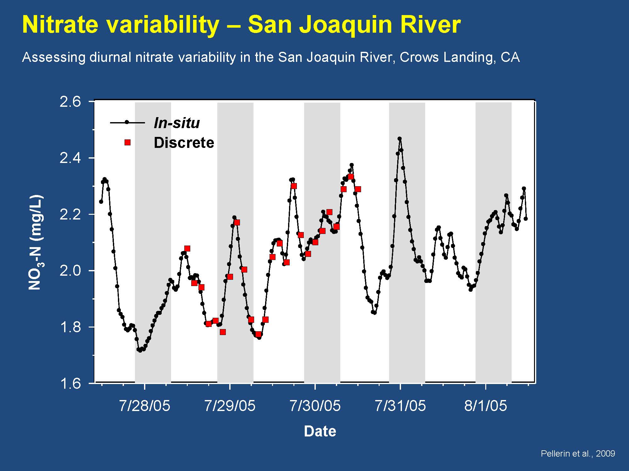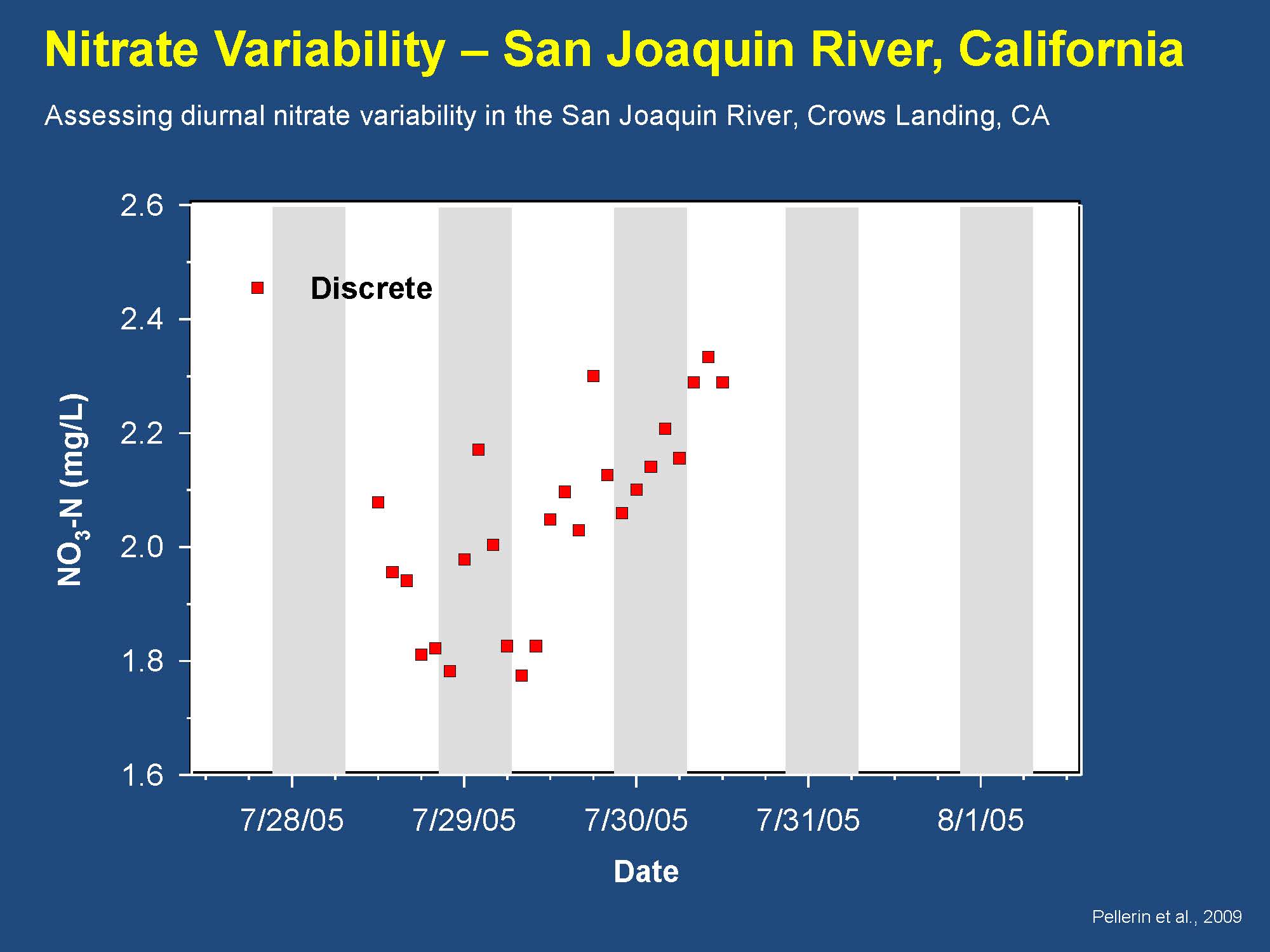 He then presented a pair of slides from Brian Pellerin that illustrate the difference between taking grab samples and using a continuous sensor.