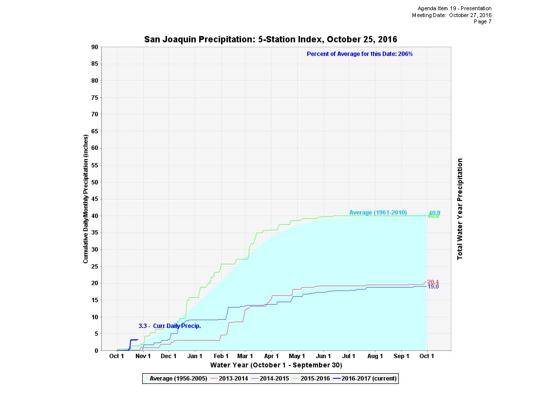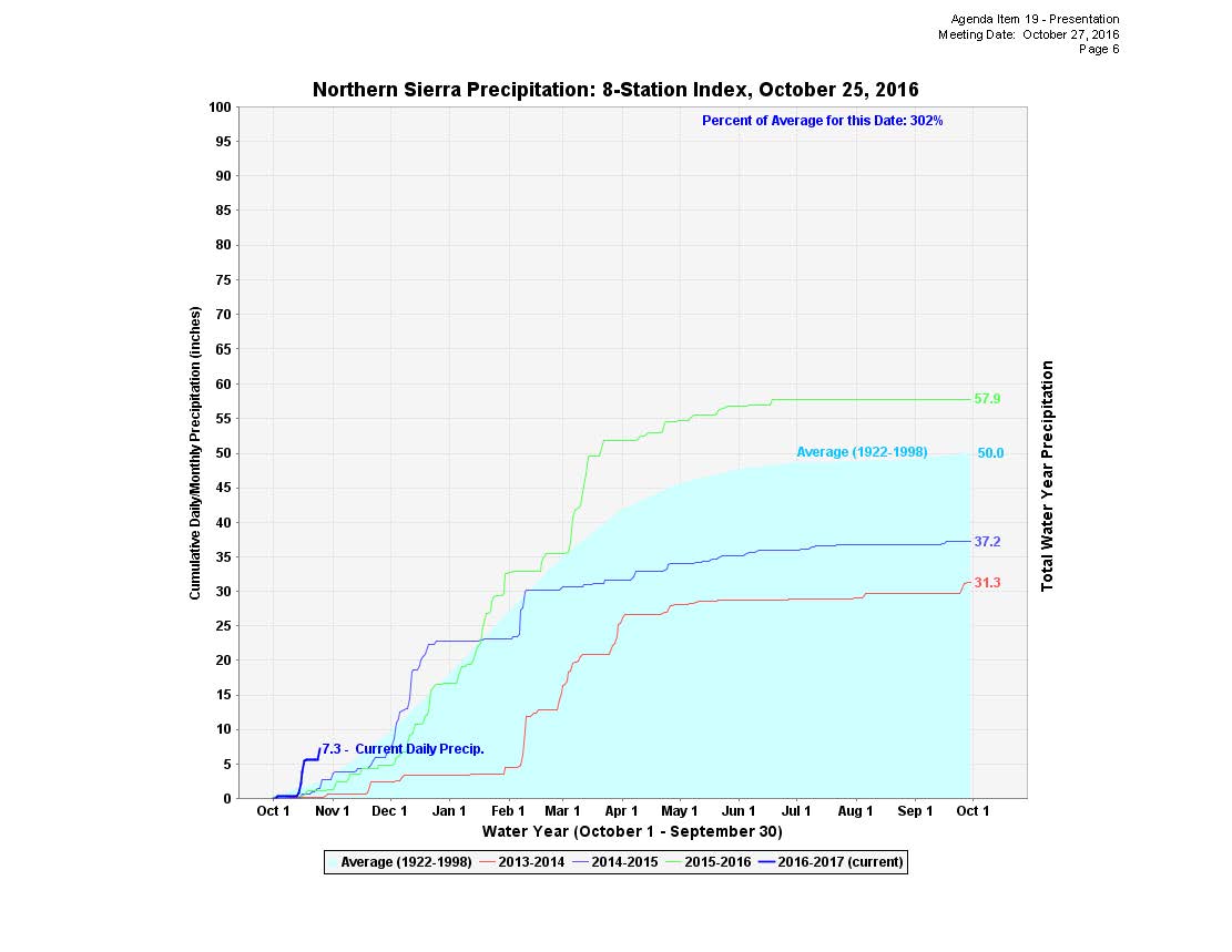 Mr. Leahigh presented a graph of the Northern California 8-station index showing precipitation, noting the precipitation for 2014 (red line), 2015 (blue line), and 2016 (green line), and the blue shaded area is average, which is 50” for the Northern Sierra. He noted that with the rains, it will be one of the wettest Octobers on record. “We did see above average precipitation for the northern part of the state,” he said. “Normally I would say that’s fairly insignificant and it is still early, but certainly what these early rains are doing is definitely priming the entire watershed much earlier than is typically the case and so any subsequent storms that we see in November and December should produce runoff a lot earlier than we would typically expect. This is somewhat encouraging going into the 2017 year.”